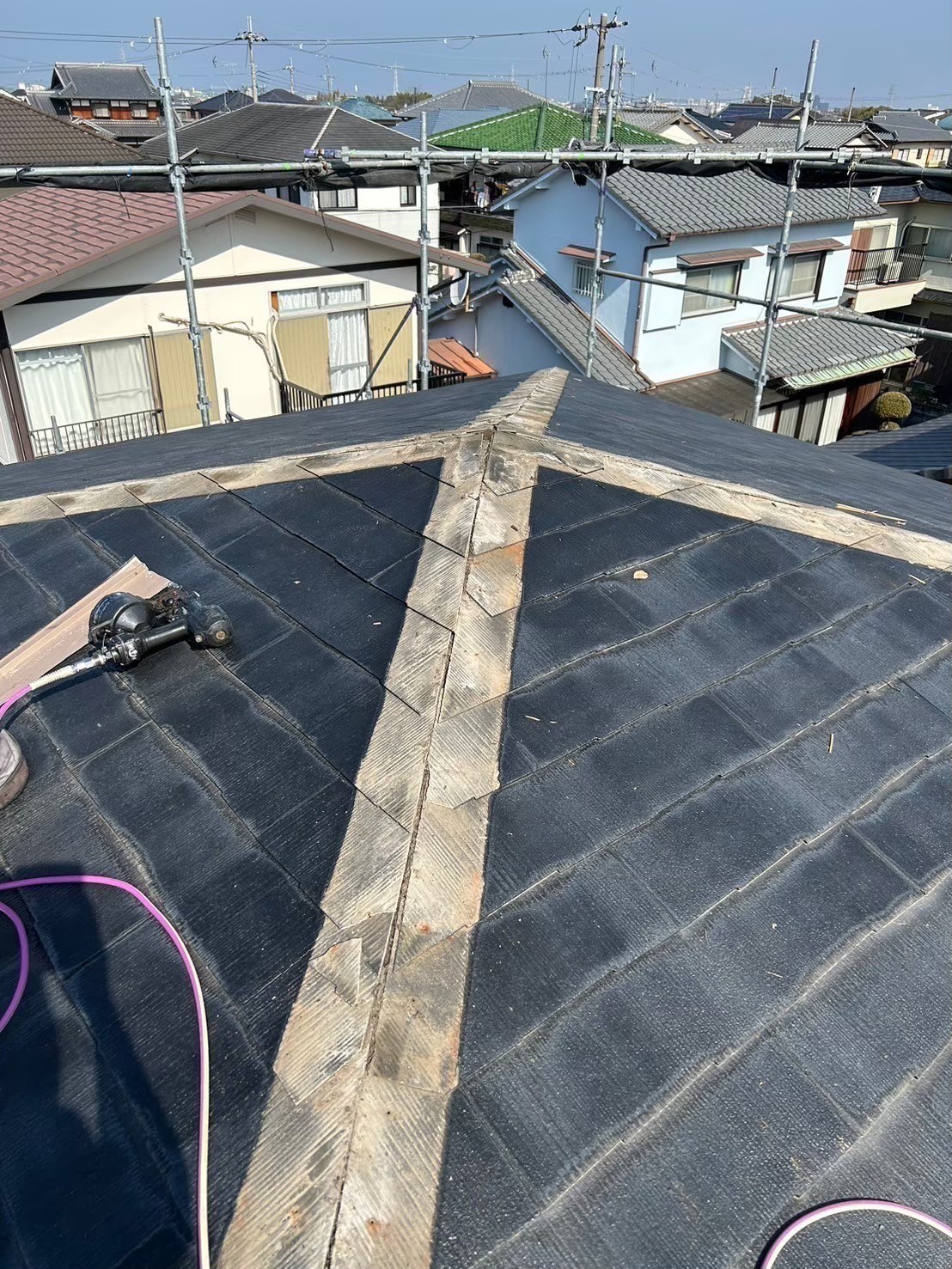 既存屋根材を一部撤去し、劣化したルーフィングを新しい防水シートへ張り替えました。 下地状態を確認しながら、雨漏りリスクの高い箇所を重点的に補修しています。