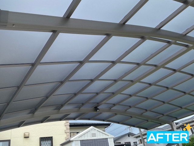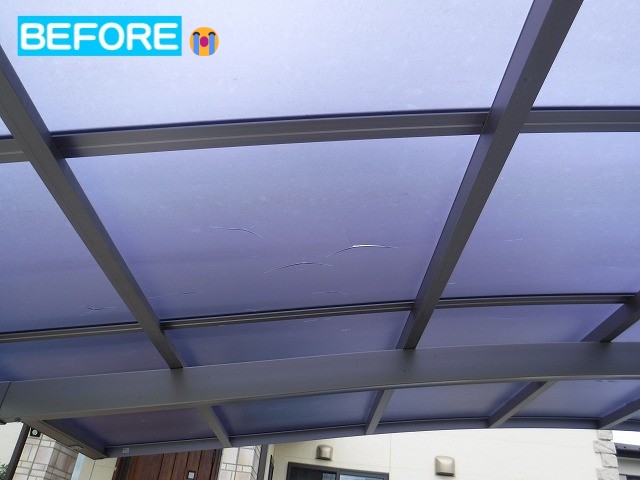 越生町で、カーポート屋根交換工事を行った様子をご紹介します。お施主様によると、最近カーポート屋根の劣化が目立ってきたので取り替えたいとのことです。無料調査の後、マットタイプのポリカーボネート平板を使用した全数交換を実施しました。