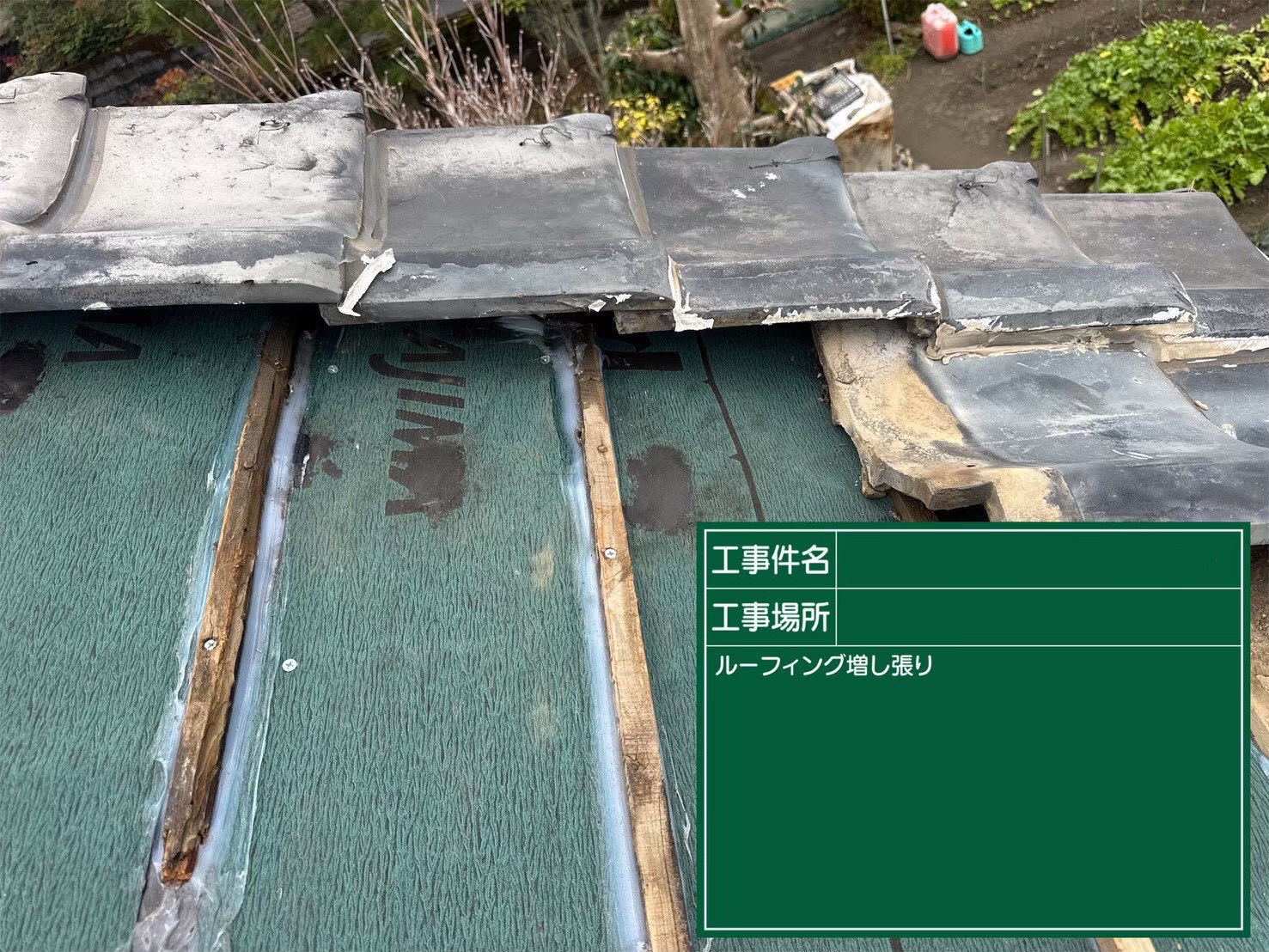 既存屋根材を一部撤去し、劣化したルーフィングを新しい防水シートへ張り替えました。 下地状態を確認しながら、雨漏りリスクの高い箇所を重点的に補修しています。