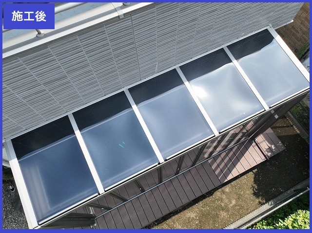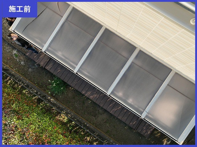 三郷市で、テラス屋根工事を行った様子をご紹介します。依頼主様によると、最近テラス屋根が経年でくすんできたので交換したいとのことです。無料調査の後、塩ビ製波板からポリカーボネート(ブロンズ)に交換しました。