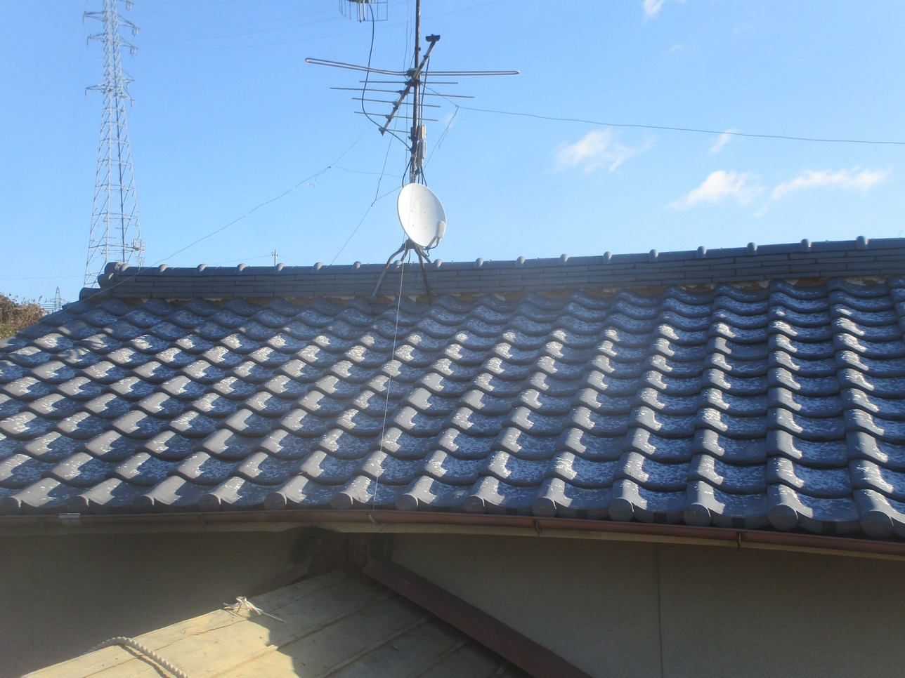 棟の巻き替え工事を行いました。 既存の棟は、経年劣化により銅線が至るところで切れてしまっている状態でした。 従来の在来工法では、棟瓦を銅線の外巻きで固定していることが多く、 銅線が切れてしまうと、棟瓦が**「乗っているだけ」**の非常に危険な状態になります。 そのため今回は、ガイドライン工法による巻き替えを実施しました。 ガイドライン工法は、耐風性・耐震性に優れ、 台風や地震などの自然災害による被害を最小限に抑えることができます。 賀茂窯業有限会社では、安全で長持ちする屋根を目指し、 このガイドライン工法での棟の巻き替え工事を推奨しています。
