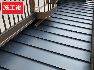 既存の防水層や劣化した下地を撤去し、屋根の状態を確認しました。 傷んでいた部分を補修し、新しい下地材を設置して強度を確保しています。 その後、防水塗料を使用し中塗り・仕上げ塗装を行い防水性能を向上させました。 屋根全体を均一に施工し、雨水の侵入を防ぐ耐久性の高い屋根へと改修しています。
