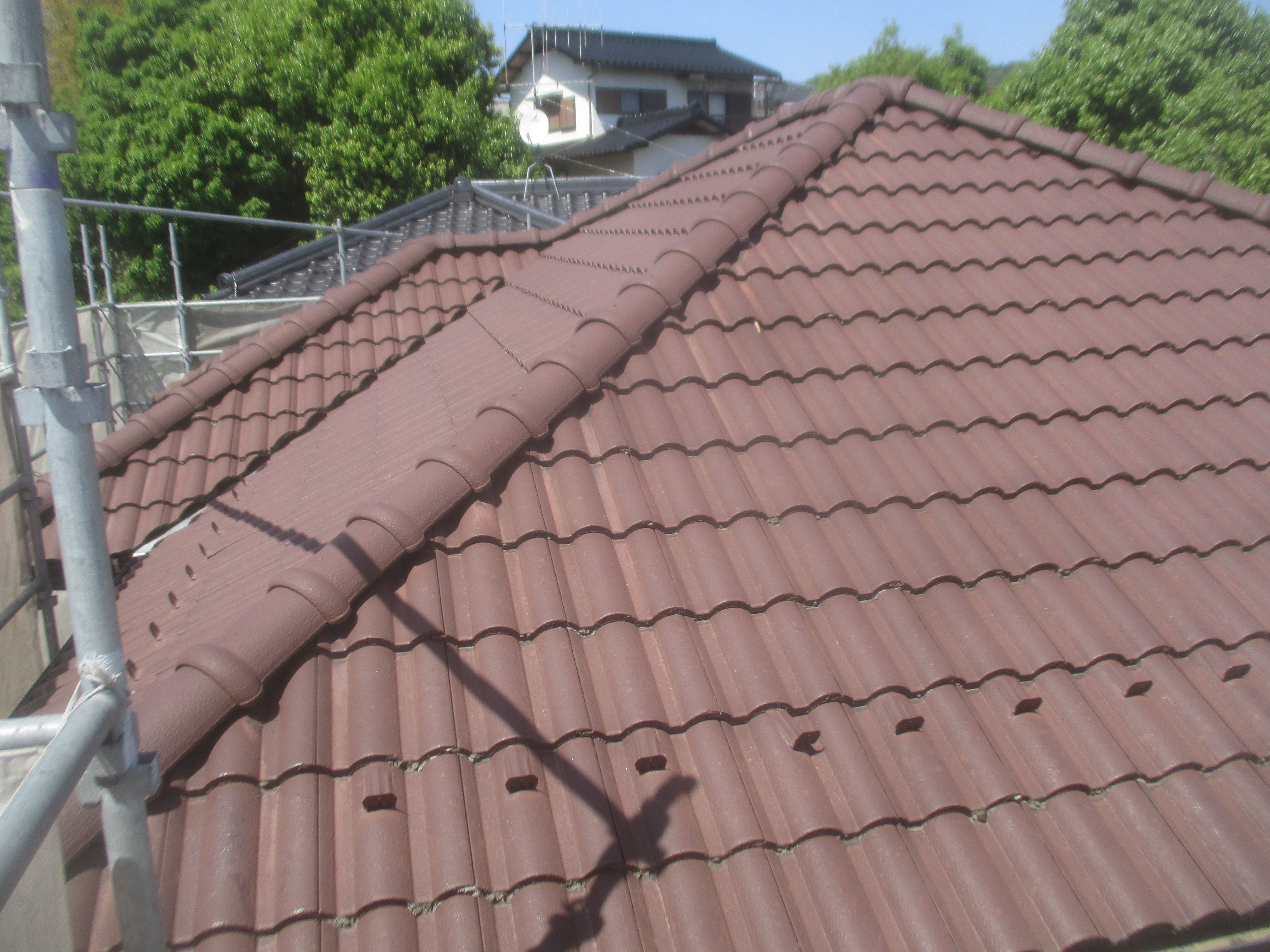 棟の巻き替え工事を行いました。 既存の棟は、経年劣化により銅線が至るところで切れてしまっている状態でした。 従来の在来工法では、棟瓦を銅線の外巻きで固定していることが多く、 銅線が切れてしまうと、棟瓦が**「乗っているだけ」**の非常に危険な状態になります。 そのため今回は、ガイドライン工法による巻き替えを実施しました。 ガイドライン工法は、耐風性・耐震性に優れ、 台風や地震などの自然災害による被害を最小限に抑えることができます。 賀茂窯業有限会社では、安全で長持ちする屋根を目指し、 このガイドライン工法での棟の巻き替え工事を推奨しています。