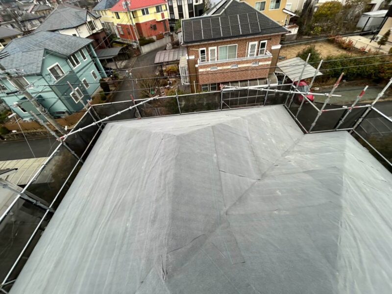 カバー工法とは、既存の屋根を撤去せず、その上に新しい防水シートと屋根材を被せる屋根工事です。 こちらは、既存の屋根の上に防水シートを敷設した写真です。