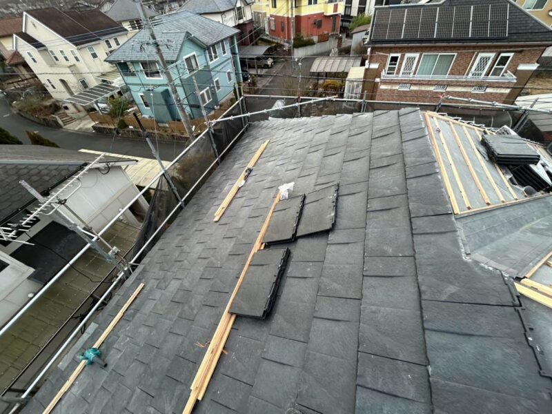 | 工事内容 | お客様より「屋根材が落ちてきた。よく見ると他にもヒビがたくさんある。このまま放置して雨漏りするのが怖いので、根本的に直したい」とのとのご依頼を受け、現地調査を実施。強風や経年劣化の影響で、スレート材の一部が完全に欠落、屋根全体に無数のひび割れが発生しているのを確認しました。 ルーガ鉄平を使用した屋根カバー工法を行い、雨漏りの不安を根本から解決しました! |