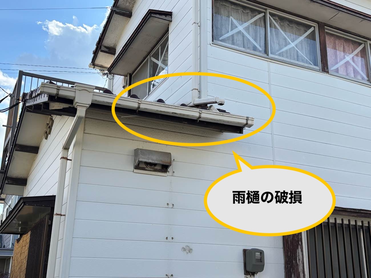軒樋と集水器に破損を確認しました。