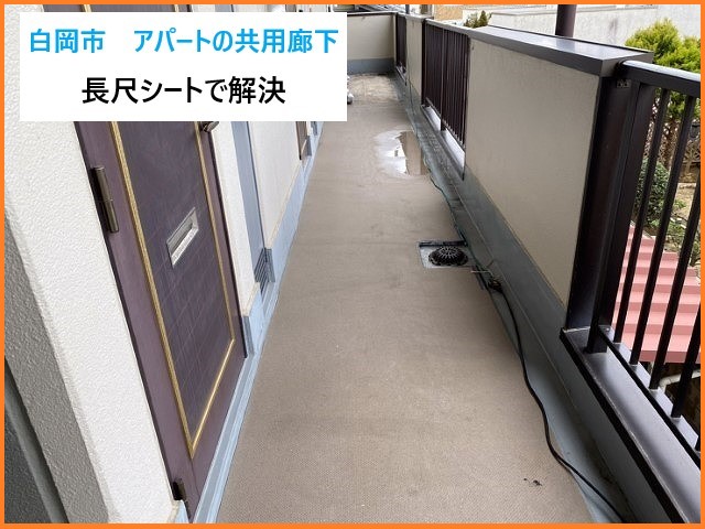 白岡市 アパートの共用廊下 水たまりを解消した長尺シート張替え 防水工事で安全と快適を実現