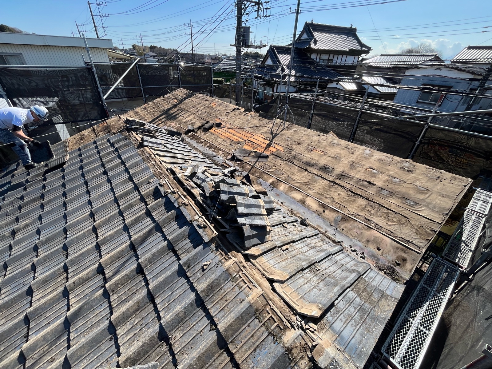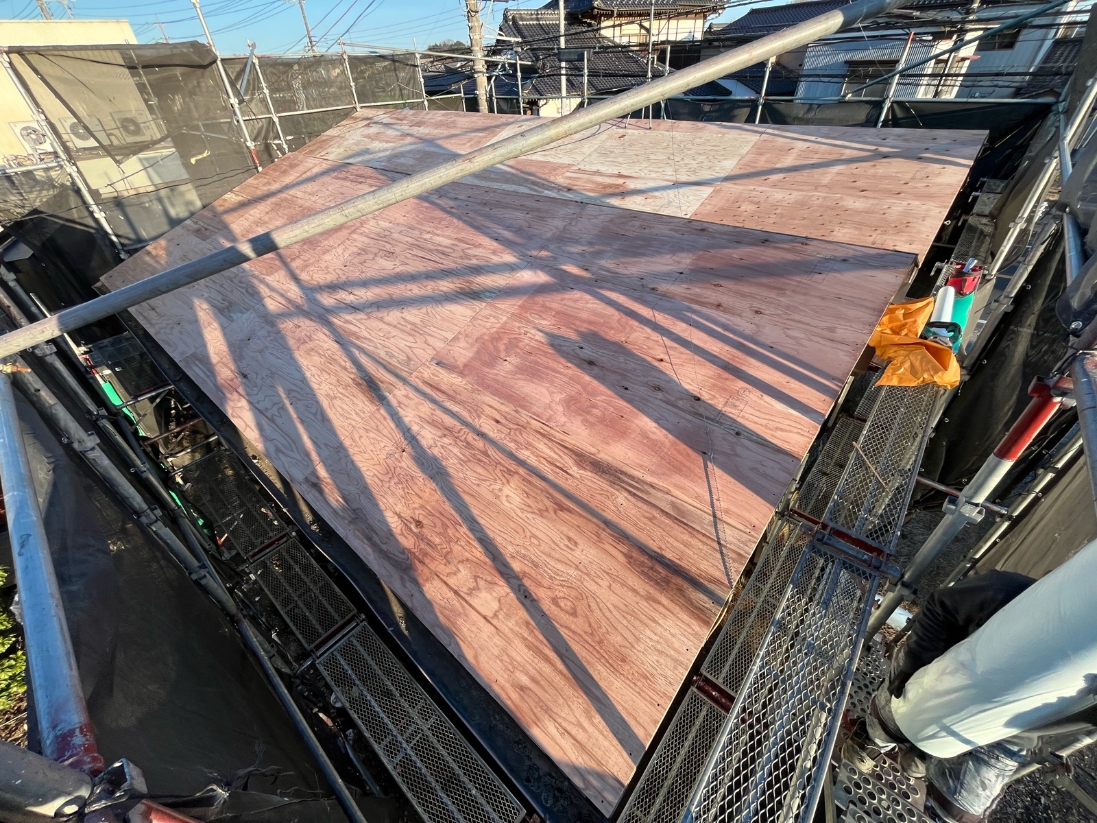 今回は屋根葺き替え工事の施工事例を紹介します。 こちらのお宅は、既存の瓦屋根のコーキングがびっしりに施工されていて、水が浸入しても逃げ道がない状態でした。 経年劣化も見られたため、既存の屋根を撤去し、新しく屋根を葺き替えました。 工事の流れとしては 既存の瓦屋根を撤去した後、 ・野地板施工 ・ルーフィング施工(防水シート) ・横暖ルーフαS の順番で丁寧に施工しています。 また、施工中は天候の変化にも注意を払い、 ブルーシートでしっかり養生を行いながら工事を進めました。 【横暖ルーフαSとは】 高耐久の金属屋根材で、軽量かつ耐久性にも優れている屋根材です。 瓦屋根と比べて建物への負担を軽減できるため、安心して長くお住まいいただけます。 更に、防水性や断熱性にも優れており、快適な暮らしをサポートしてくれます。
