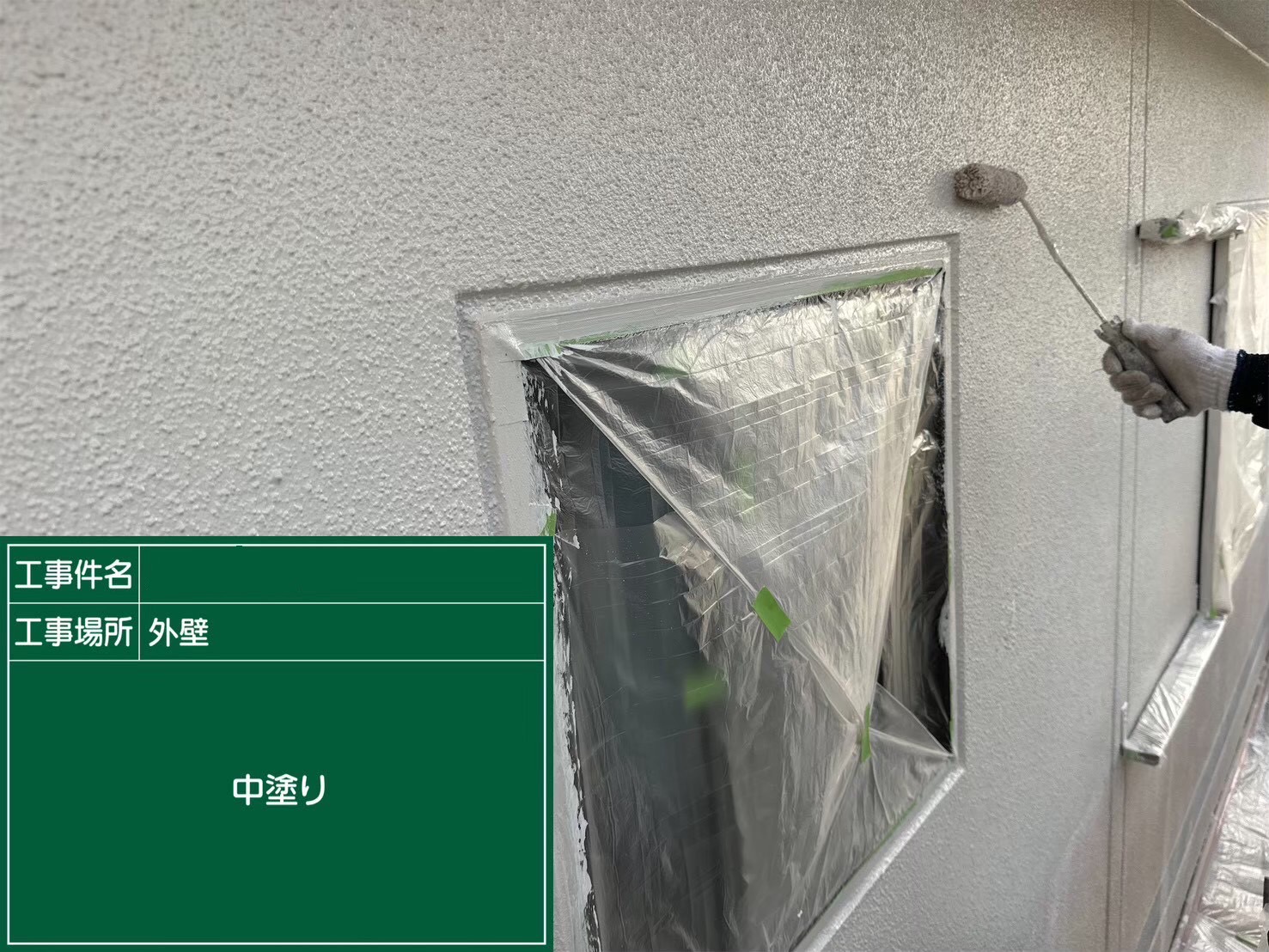 下地補修・下塗り後、塗膜に厚みを持たせるため、均一に中塗りを施工しています。