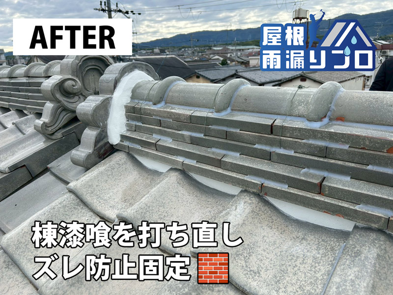 劣化して役割を果たしていなかった古い漆喰を瓦を傷めないよう慎重に撤去し、密着性と耐久性を高めたうえで新しい漆喰を打ち直すとともに、🏠 瓦のズレを一枚ずつ正しい位置へ復旧し要所をコーキングで固定、さらに ☔ トタン部分は下地処理後に塗装を行い、屋根全体の安定性・防水性・耐久性を高めた仕上がりとなっています。🔧