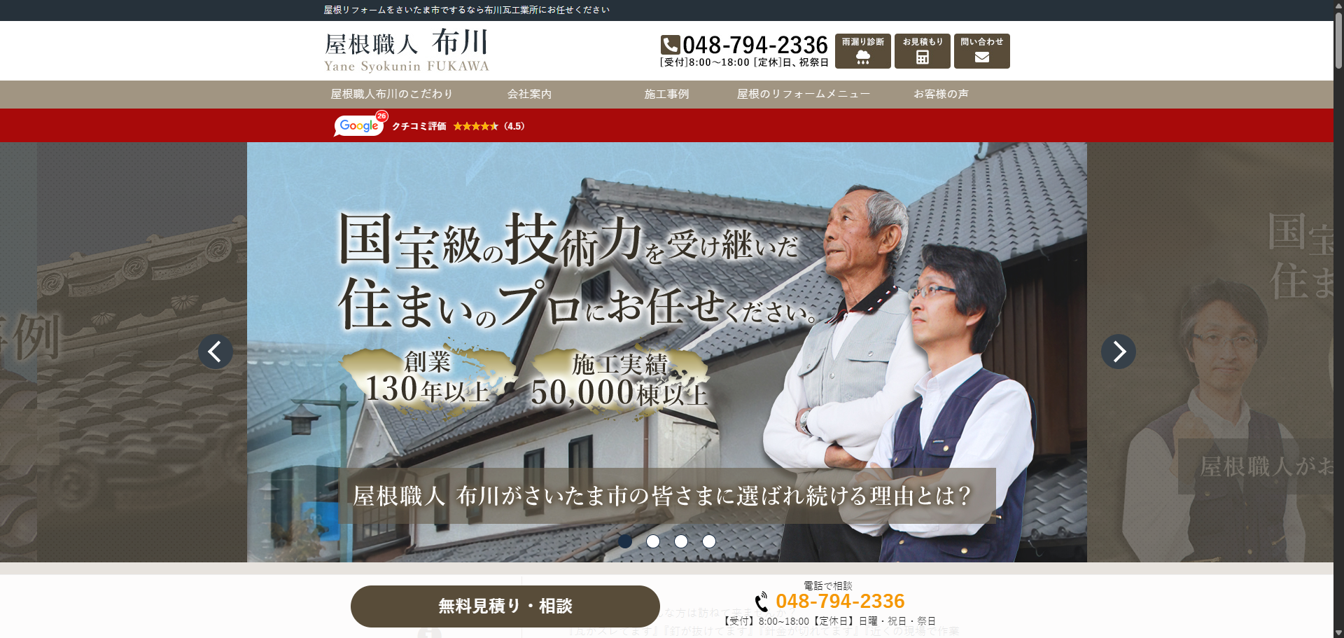 さいたま市を拠点に、屋根工事、葺き替え、雨漏り修理、屋根塗装、カバー工法、雨どい・防水工事まで幅広く手がける屋根工事会社です。完全自社施工を強みに、現地調査から施工、アフターフォローまで一貫対応しています。