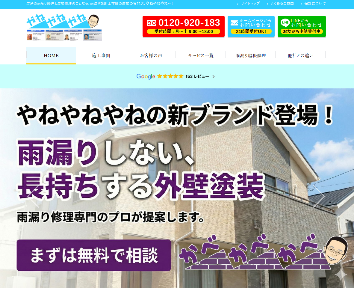 私達の仕事は「雨漏り修理」「屋根修理」ではありません。 ご挨拶の出だしから、奇をてらうような言葉で申し訳ありません。でも、これが心からの本音です。 もちろん、やねやねやねの仕事は「雨漏り修理」「屋根修理」がメインの業務です。 屋根工事は屋根修理業者としてのメイン業務の仕事ではありますが、お客様にとってはお困りごとを解決するための「手段」として屋根修理業者である「やねやねやね」にお問い合わせをいただくに過ぎません。 屋根工事を屋根業者に依頼することが、お客様の本当の「目的」ではないはずです。仕事をする上では、この「手段」と「目的」をはき違えてはいけません。 仕事をする上で、『手段と目的を履き違えた仕事だけは絶対にしないように』と、毎日社内ではこのことをお互いに確認しあいながら業務にあたっています。 お客様が求める、「本当の目的」は何か。 お客様が屋根工事や雨漏り修理の業者に求めている本当の目的とは。これをいつも考えています。この答えを即答できる屋根の業者は、広島にいったいどれだけあるでしょうか。 また、現場でお客様と接するスタッフや職人が、どこまで行動でお客様に示せているでしょうか。そして、お客様にはどこまで伝わっているのでしょうか。 実際に施工をさせていただいたあと「良かったな」と心から思っていただけること。それは何より嬉しいことではあります。しかし、それはプロとしては当たり前のこと。屋根やの「プロ中のプロ」としては、それよりもさらに前の段階から、お客様のことをもっと理解しなくてはいけないのではないかと感じています。 お客様は私達にお問い合わせを頂くその前の段階から、様々なことを考えられたはずです。 屋根の修理、屋根工事の施工を検討するきっかけや、実際にお問い合わせを頂く前に思い悩んだ時間。お問い合わせをする直前に少し緊張されていらっしゃったかもしれません。お問い合わせをいただく前の段階でもすでに、お客様にはさまざまな心理的なご負担があったことと思います。 私たちの本当の仕事、本当の仕事の目的は広島の屋根の不安を”0″にすることです。 雨漏りや屋根工事にまつわる全ての『不安』を『安心』に変え、心から安心した生活を過ごしていただくことです。これを使命に仕事と向き合い、毎日お客様と向き合っております。 ですから、施工後の安心はもちろんのこと、お問い合わせいただく前の段階から、わたしたちの仕事は始まっています。このようにホームページでわたしたちの想いをお伝えすること、お問い合わせ後のご対応、屋根の診断の内容、実際の施工、施工後のお客様の生活。そして、5年後、10年後に改めて「良かった」と感じていただくこと。全て通じて「良かった」と感じていただけることが、やねやねやねの仕事です。 お客様に安心してお仕事をお任せいただける「広島の屋根業者」の中では、その辺の工務店には絶対に負けない想いがあります。 広島で1番のやね屋の精一杯の心意気、是非体験してみてください。