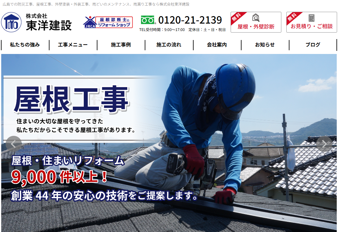 「株式会社東洋建設」は、昭和56年、屋根工事会社として広島市佐伯区に創業いたしました。 先代から代表を引き継いだ後も、大勢のお客様に支えていただき、数多くの経験を積んで参りました。 現在は、当社の強みである屋根工事や外装工事、外壁塗装工事を中心に、住まいのトータルリフォーム会社として、様々な工事を施工させていただいております。 日本瓦をはじめ、金属屋根材、新素材の屋根材が出る中で、お客様の住まいに最適なより良いご提案・施工が出来る様に日々努めています。 私たちは、大切な住まいをお任せいただいている責任感を持ち、お客様との信頼を築き上げられるように繋がりを大切にしています。 ご依頼くださったお客様に、東洋建設に頼んでよかったと言っていただけるよう、感謝の気持ちを忘れず、地域の皆様の生活に貢献出来るように取り組んでいきたいと思っております。