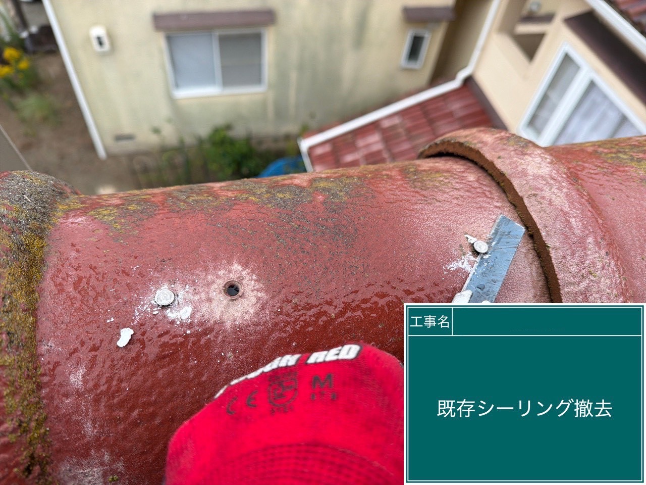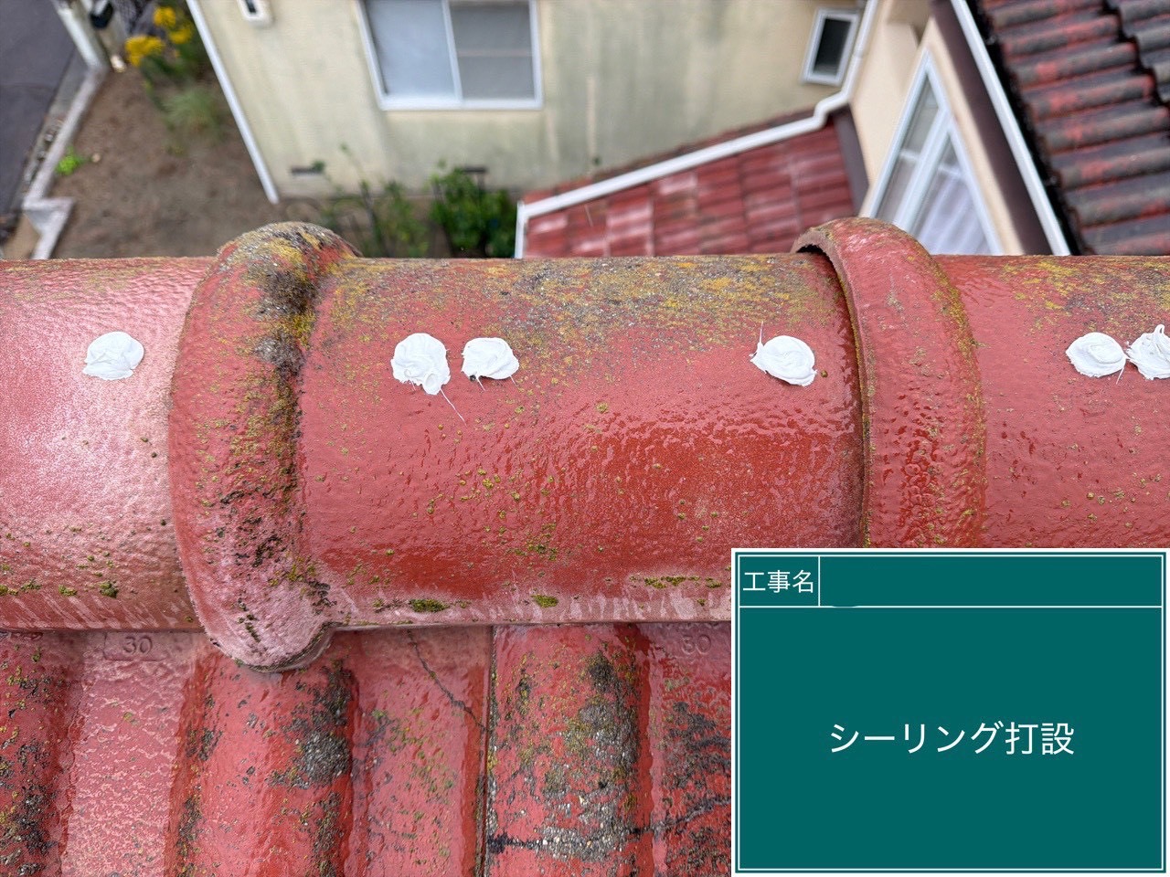 | 工事内容 | 棟瓦部分の既存シーリングが劣化しており、雨水が浸入する可能性があったため補修を実施しました。 古いシーリングを撤去し、新たに防水性の高いシーリング材を充填することで雨漏りリスクを解消しています。 |