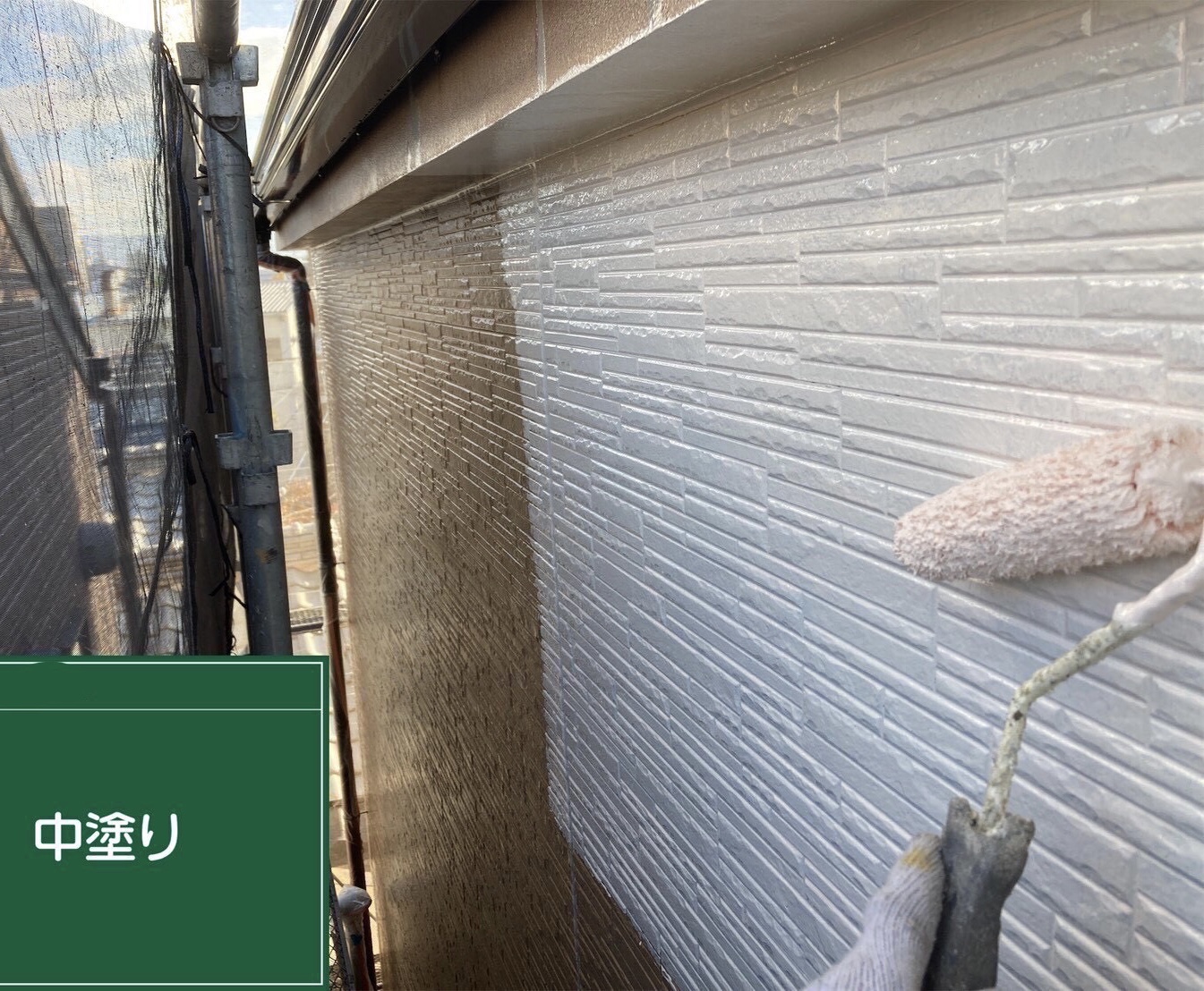 下塗り後、下地と仕上げ塗料の密着性を高めるため、中塗り塗装を均一に施工しています。
