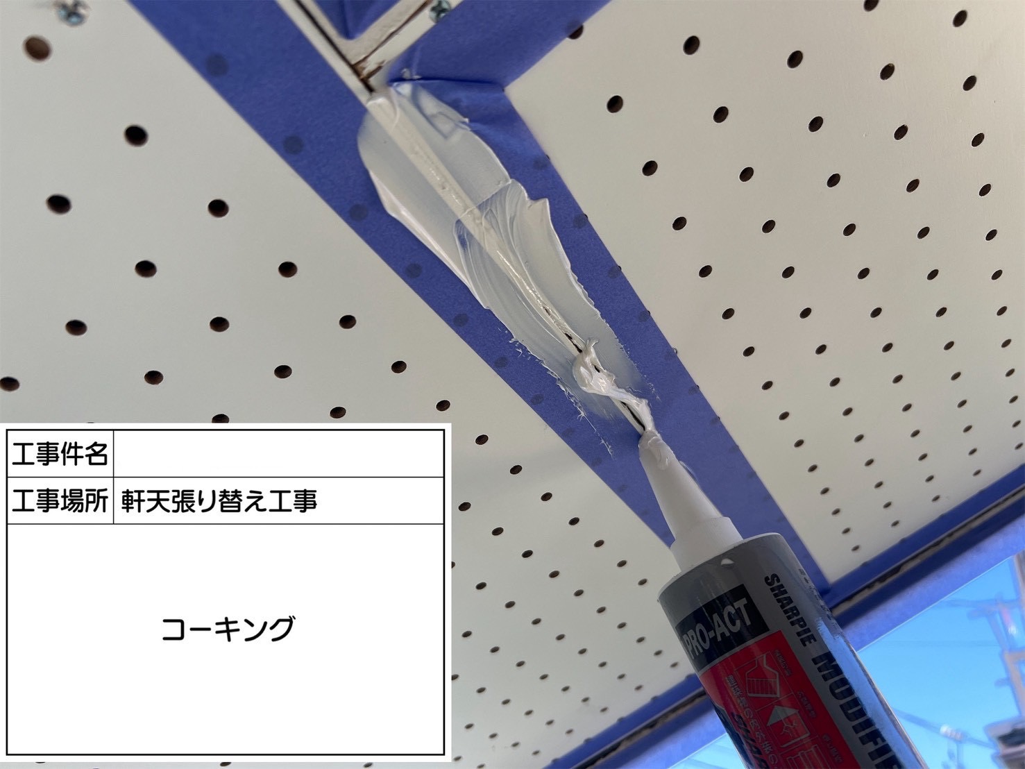 既存の軒天材を撤去し、新しいボードを張るための下地を整えている様子。