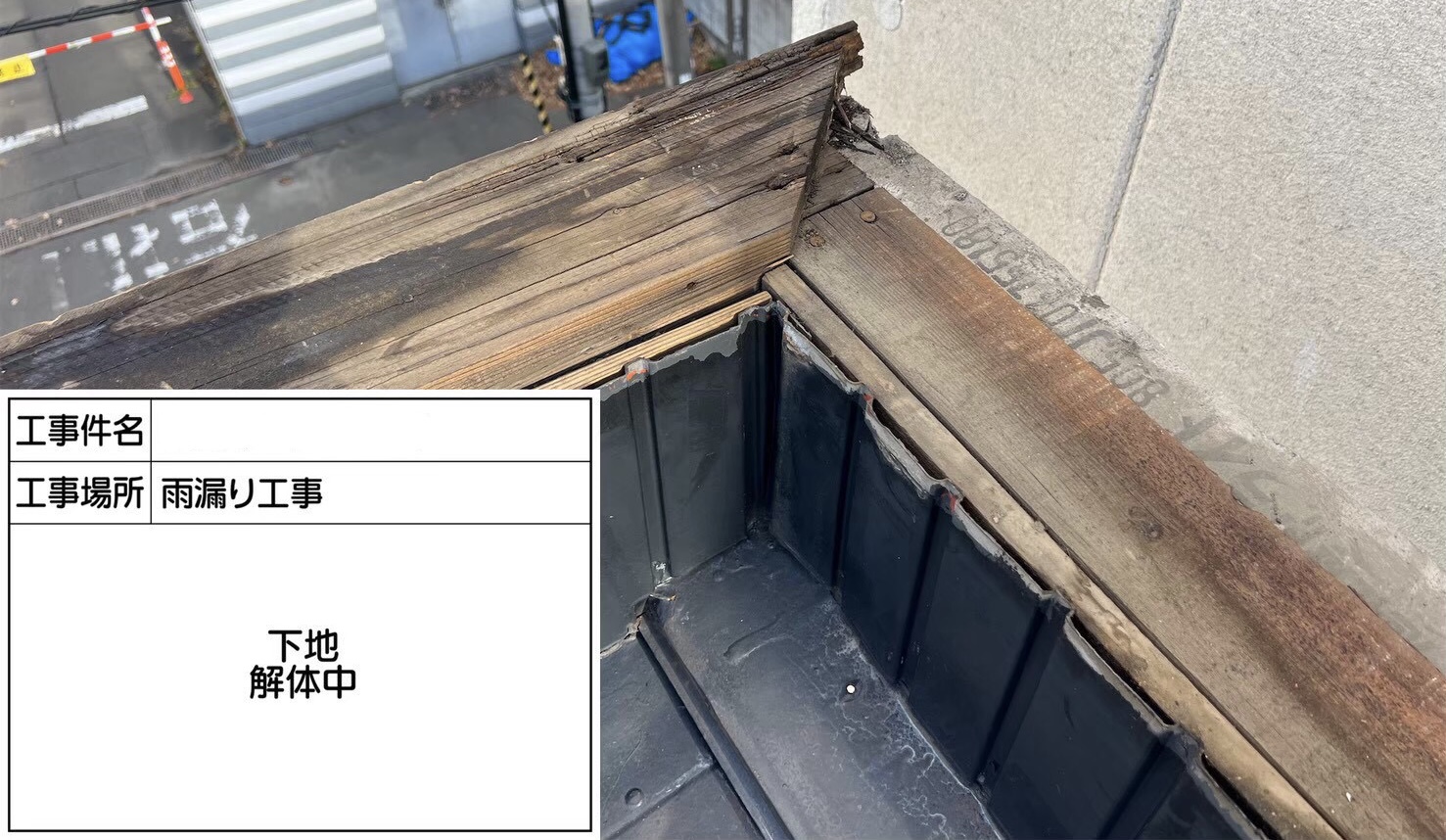 | 工事内容 | 雨漏りが発生していた箇所の下地を解体し、劣化部分を新しい木下地へ交換しました。 その後、防水シートを施工し、雨水の侵入を防ぐ構造へと補修しています。 |