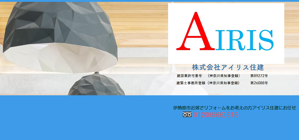 伊勢原市近郊でリフォームをお考えの方、ご連絡お待ちしております。 『株式会社アイリス住建』は1997年の創業以来、神奈川県伊勢原市を中心に厚木市、秦野市、小田原市等の神奈川県の西湘地域に根付いたリフォームを中心に住宅工事を行っております。 その豊富な経験や知識を活かして、これまでにも様々なお客様のリフォームに関するご要望にお応えしてまいりました。 「まごころ施工」で低価格&施工以後のメンテナンスにも迅速に対応いたしております。 伊勢原市近郊のリフォームに関すること、住宅に関することは『アイリス住建』へご相談ください。