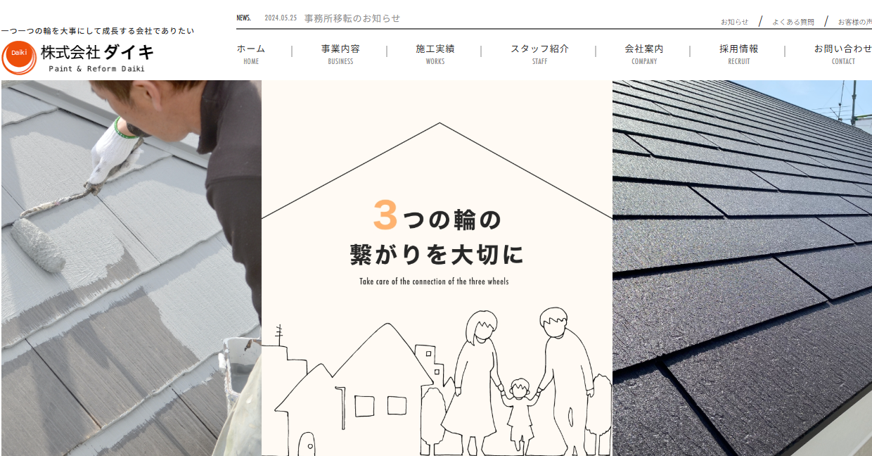 「一つ一つの輪を大事にして成長する会社でありたい」 弊社のホームページをご観覧いただき誠に有難うございます。 株式会社ダイキは、私の地元である神奈川県横浜市を中心に神奈川、東京都23区エリアで塗装工事業、各種リフォーム工事業を営んでおります。 私が常に意識していることをダイキのロゴマークにしております。 ロゴマークの意味ですが、入っている3つの輪の重なりは お客様の輪、関連会社様の輪、ダイキの輪です。弊社の事業内容である塗装、リフォーム業はダイキ1つの輪では成り立ちません。3つの輪があって初めて成り立つ仕事です。 「一つ一つの輪を大事にして成長する会社でありたい」 そんな思いが込められております。 それを実現するために日ごろからお客様に満足していただけるよう、個々のお客様に合ったご提案、丁寧な仕事と対応を心掛けています。 是非、皆様の大切なお住まいを更に快適に、そして楽しく暮らしていける為のお手伝いをさせて頂ければ幸いです。 社員一同、「すべてのお客様に信用され、信頼され、必要とされる会社」を目指して日々仕事に取り組んでおります。 どんな小さなことでも、まずはどうぞお気軽にご相談下さい。