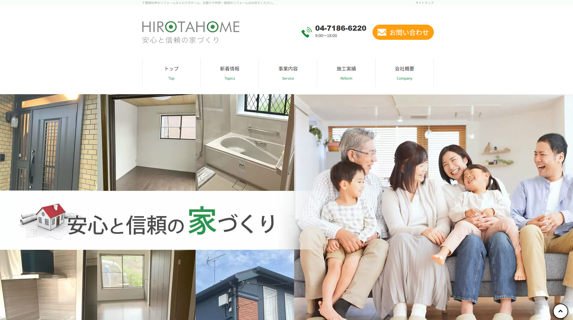 千葉県柏市の工務店・ヒロタホームです。 安全・安心な住まいづくりをモットーに、快適に暮らせるよう住む方の視点できめの細かいサービスを心がけております。 施工品質・提案・価格に自信があります。 新築注文建築・内外装リフォーム・防音・オール電化、ガラスサッシ工事、介護工事、設備機器工事・エクステリアなど、当社は施工・管理まで自社でおこなっております。 無料で見積もり・プラン作成いたしますので、柏、松戸、流山、野田、我孫子、鎌ヶ谷にお住まいの方はぜひ一度ご相談下さい。