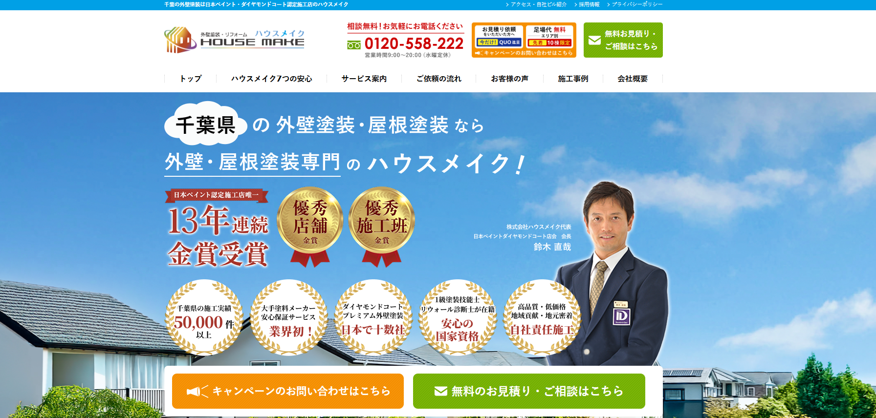 塗装業界に携わって30年。 元大手塗料メーカー特約店での勤務経験があり、施工に関しては大手ゼネコンの塗装工事管理経験を持っています。 「こうしたらもっとよくなるのに……」と感じても予算や立場的に指示通りの施工しかできない現実に次第に不満を持ち、また「もっとお客様の希望に応えたい」と強く思うようになりました。 この想いを実現するために一念発起し、ハウスメイクを立ち上げました。 また、日本ペイント・ダイヤモンドコート認定施工店において12年連続全国No.1(※2023年ダイヤモンドコート店会調べ)になった他、施工店会の会長を任せていただいております。 地域への貢献が出来るように、これからも精進して参ります。