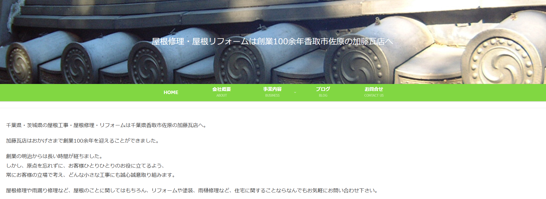 はじめまして、加藤瓦店代表の加藤忠志でございます。 加藤瓦店は香取市佐原の屋根工事専門店として、 おかげさまで創業100余年を迎えることができました。 深く感謝を申し上げます。 これを期に原点に立ち返り、お客様ひとりひとりのお役に立てるよう、 常にお客様の立場で考え、どんな小さな工事にでも誠心誠意取り組みます。 これからも地元の皆様に愛され、必要とされる加藤瓦店であり続けられるよう、 スタッフ一同、努力していきます。 お気軽にお問い合わせ下さい。