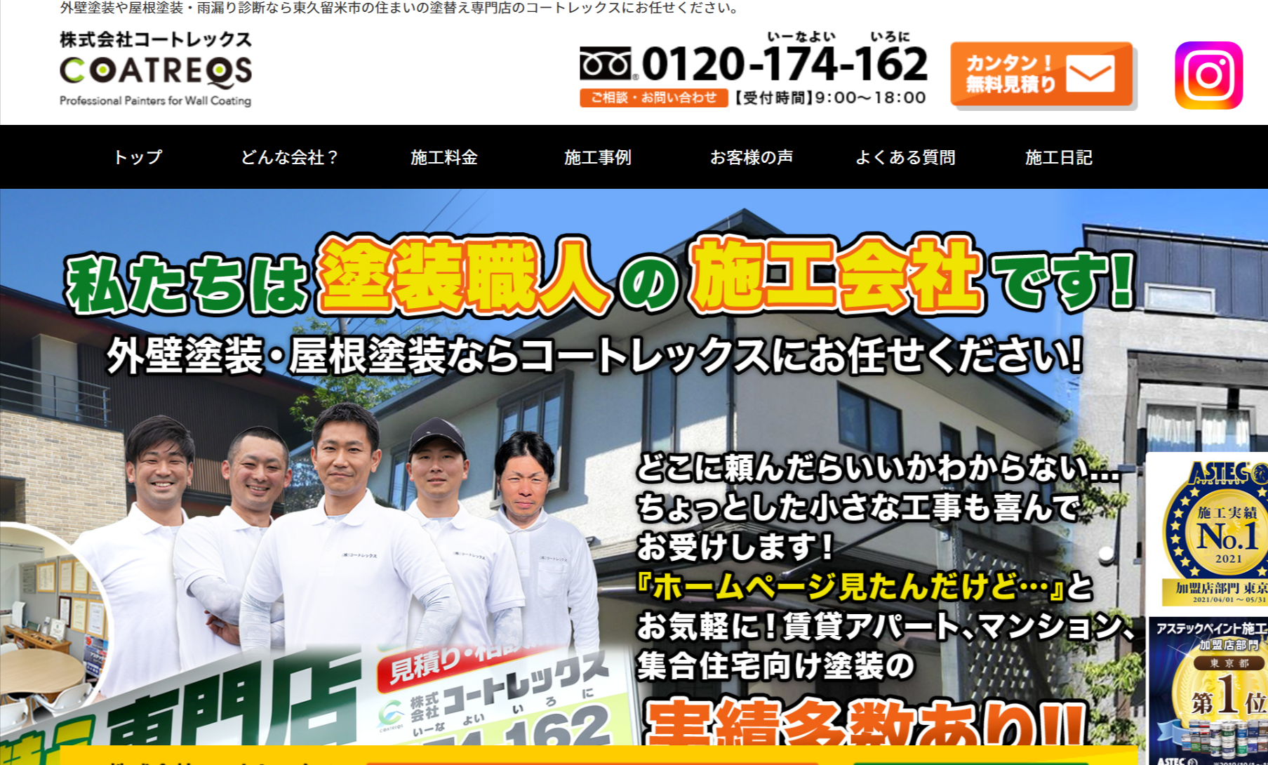 | 対応可能な内容 | 外壁塗装工事 屋根塗装工事 内装塗装工事 吹付塗装工事 防水工事 シーリング工事 仮設足場工事 ペンキ塗り コンクリート打ち放し補修(特殊塗装) 残置物処分工事 アパート・マンション塗装工事 屋根カバー葺き替え工事 雨漏り修繕工事 雨漏り110番 東久留米店 |