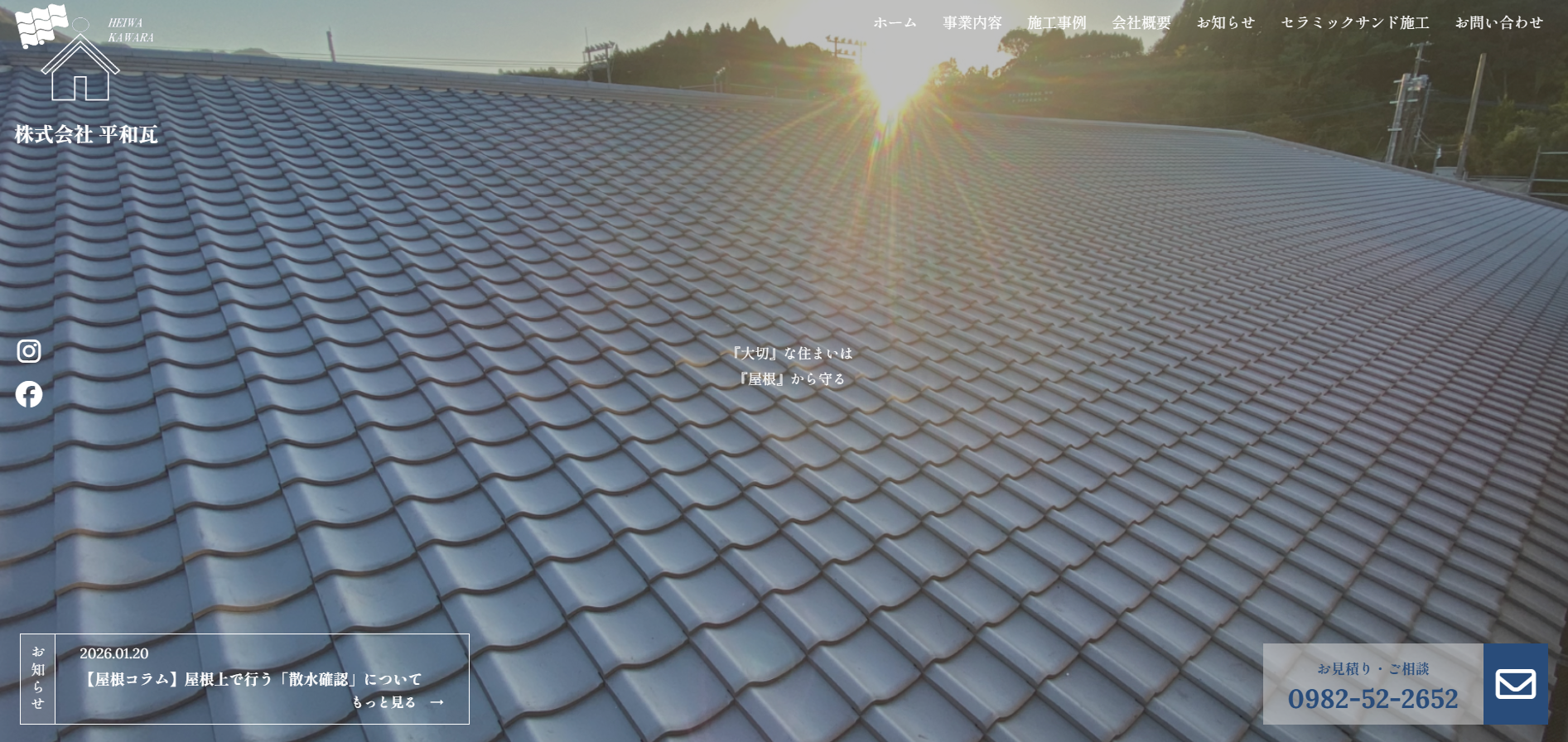 株式会社平和瓦は、瓦工事を中心に屋根工事や雨漏り修理などを行っております。 屋根点検や修理を通じて、住まいを守る施工に取り組んでおります。 今後も屋根工事を通じて対応してまいります。