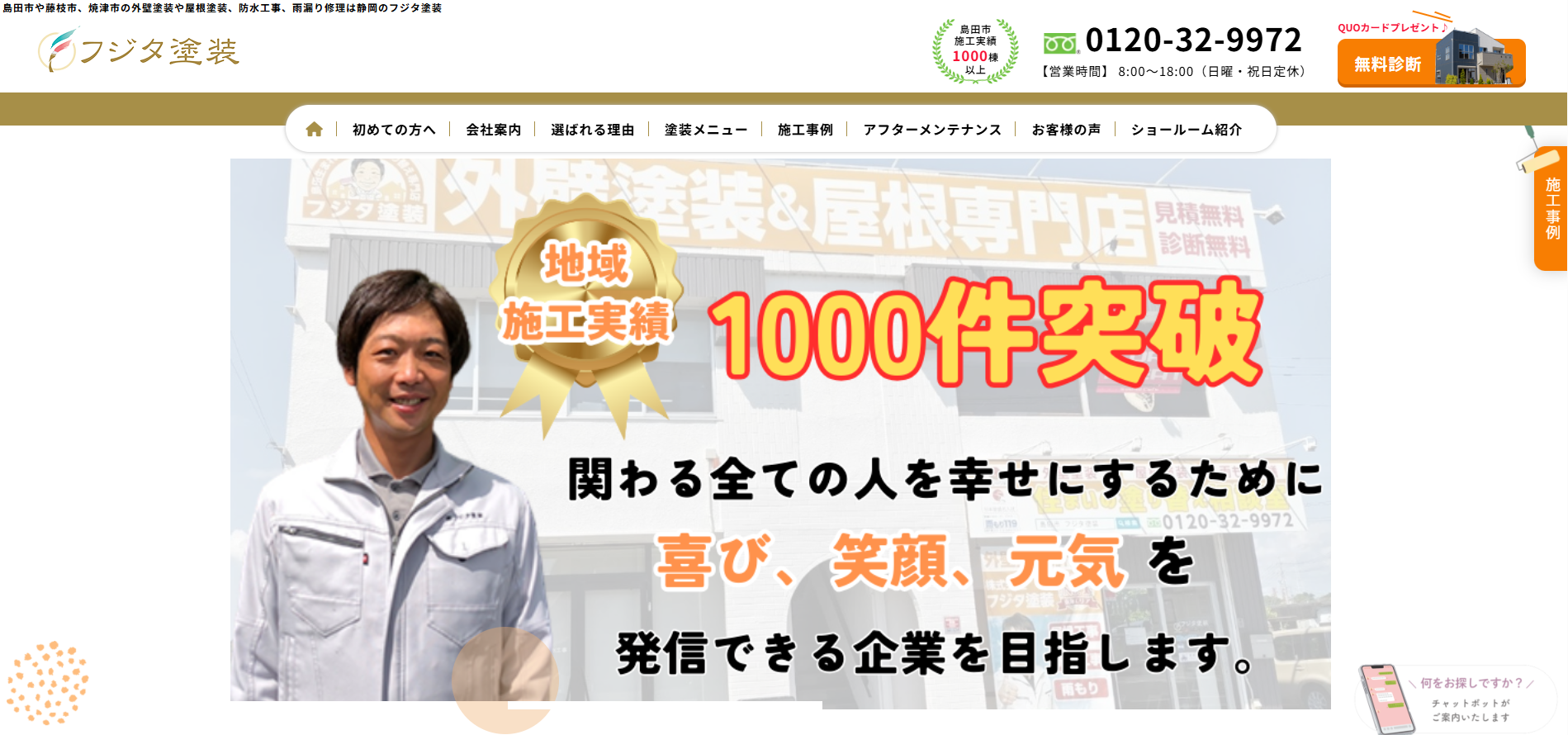 | 対応地域 | 静岡県島田市・藤枝市、牧之原市、焼津市、吉田町 ※その他の地域も対応します!お気軽に島田市・藤枝市、牧之原市、焼津市、吉田町のフジタ塗装までお問合せください! |