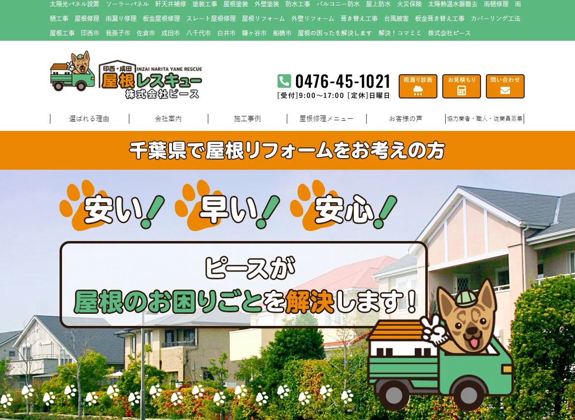 皆様、はじめまして。 弊社のホームページをご覧いただきまして、ありがとうございます。 弊社は東葛地域を中心に「台風や地震に強い屋根を作る」ことに一貫して、屋根工事に特化した外装工事業者として歩んできております。 開業当初から「わかりやすい丁寧な説明」と「迅速な対応」を第一に心がけ、施工対応地域は千葉県、茨城県と、広い範囲でご対応させていただいております。 責任施工と確かな技術で地域の皆様よりご信頼をいただき、施工実績は13,000件を超えました。 和瓦、洋瓦、スレート、ガルバリウム鋼板、ルーガ、太陽光、雨樋の屋根工事全般を承っております。 屋根・雨樋・太陽光・外壁・防水など外装周りのお家のお手入れは同じサイクルで巡ってきます。 そのため、弊社では屋根工事のみではなく、外装工事一式すべてお任せいただける体制を整えております。 長年の経験で培った技術や最先端の施工方法を取り入れ、各地域の風土と気候を把握した上でお客様のご要望やご予算などをお聞きし、適切な施工方法をわかりやすく丁寧にご説明、ご提案をさせていただきます。 わからない部分などがございましたら、お気軽に何でもお聞きください。 私共はお客様のご要望を第一に考えライフプランに寄り添った必要な工事しかご提案いたしません。 もちろん必要のない工事は勧めませんし、10年後、20年後を見据えて必要な工事であればその点を詳しくご説明させて頂いております。 色々なご要望をお聞きした上で、最適な工事のお見積もりを作成し、お客様にお選び頂いております。 弊社では、材料の大量仕入れで原価削減を実現し、【高品質な施工をリーズナブルにご提供】することに力を入れております。 お客様へのご提供金額を安く設定したことにより後々問題が発生してしまう手抜き工事をしないことはもちろんのこと、グレードの低い材料は取り扱っておりませんので、 費用対効果が高く、価格とサービスに自信があります。 基本的に、値引きは行っておりません。大幅な値引きを出来るということは元々の設定価格が高額もしくは、必然的に屋根材や副資材の材料のグレードダウンへと繋がってしまうからです。 また、日ごろから大手ハウスメーカーのリフォーム工事も請け負っており、屋根商材のプレゼンや、施工方法の勉強会なども開催させて頂いておりますので、ホームページからの直接のご依頼もご安心ください。 他者様の見積りが適正かどうかの診断も可能です。 「他社に見積もりをとったけど、適切な内容なのか分からない」「悪質業者に騙されたくない!」など、不安を抱えているお客様は、私たちがプロとして内容を見極め、診断いたします。 また、弊社では屋根診断・ご提案・施工・アフターサービスに至るまで、一貫してお付き合いさせていただきますので、安心してお任せください。 日本全国多数の屋根工事店とのお付き合いがあり、日頃から屋根に関する情報交換や技術研鑽を行っています。 この独自のネットワークを活かし、互いに災害時には緊急応援に駆けつける協力体制があります! もし地元で災害が起きたとしても、県外の職人を手配でき、素早く復旧対応を行うことができます。 工事完了後にはお客様の目に付きにくい屋根だからこそ、安心して頂けるよう工事の工程を写真と詳しい説明付きで全現場に〔施工完了報告書〕を作成しお客様にお渡ししております。 「工事の全体的な流れや、丁寧な施工をしていることが写真と説明でわかり、安心!」と、お客様より大変ご好評いただいております。 どんなに小さなことでも屋根でお困りの方、外装のリフォームをお考えの方はお気軽に株式会社ピースにご相談ください!