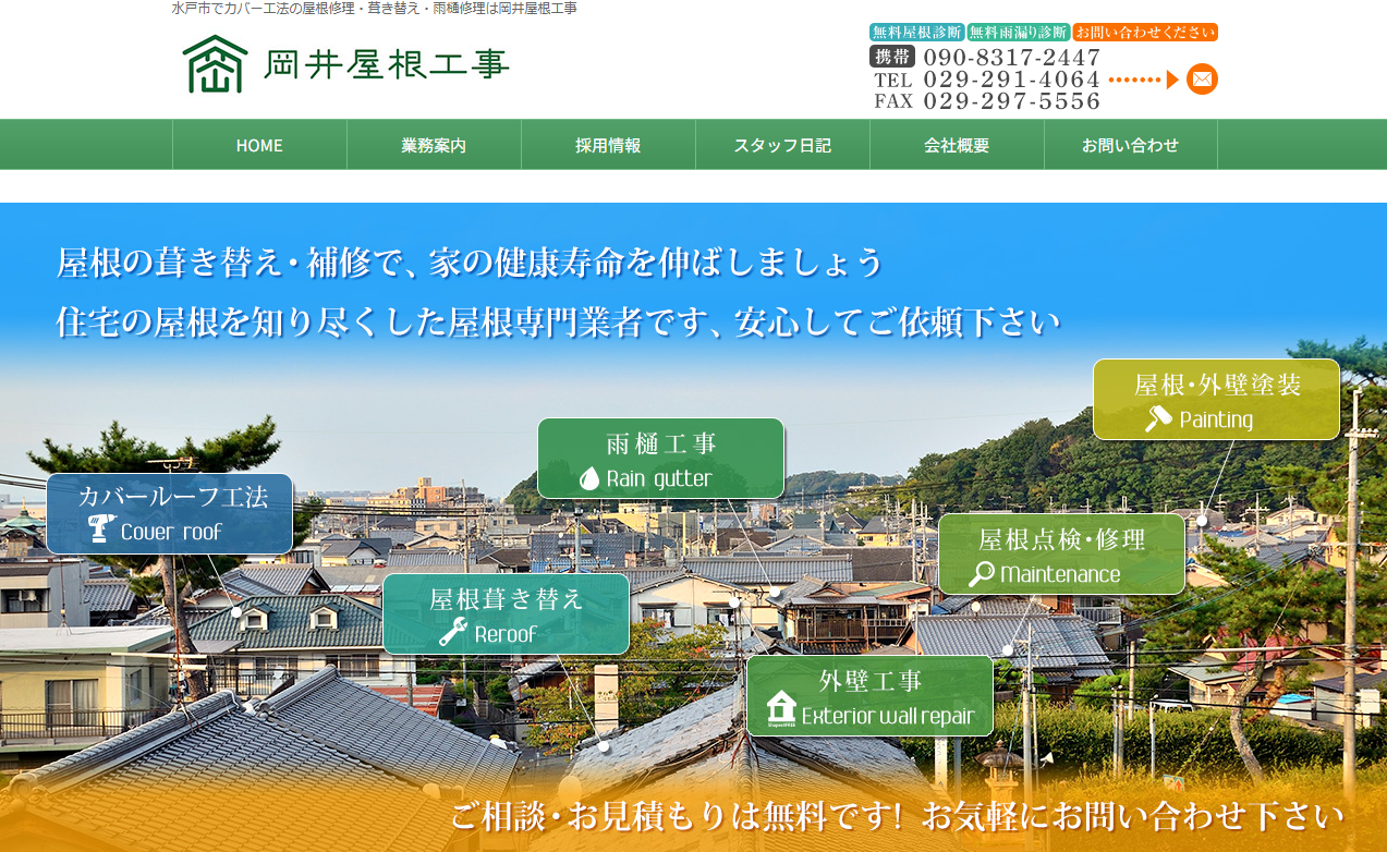 『岡井屋根工事』は、水戸市を中心に茨城県内全域で、屋根葺き替え工事をはじめ屋根に関する様々な工事を業界歴22年の代表が行っています。 屋根は、家や建物及びそこに住んでいる人を雨・風・雪・紫外線から守るとても大切な役割を担っています。常にダメージを受けている事もあって、どんなにしっかり作られていても経年劣化は避けられません。 劣化を放置しておくと雨漏りやひび割れ等が起き、家や建物の寿命を縮める事につながり、補修の為の費用がどんどん増えていきます。 問題を見つけた時は、直ちに不具合の状態に応じた適切な補修を行う事がとても大切です。 ちょっとした雨漏りだからと放置せず、まずは一度、岡井屋根工事までご連絡下さい。 ご相談・お見積もりは無料で行っています。