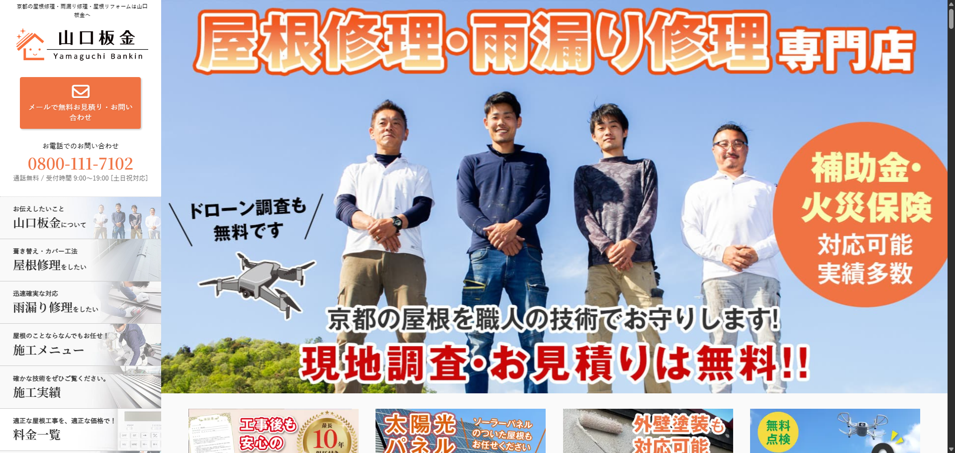 京都市中京区を拠点に、屋根工事、雨漏り修理、塗装関連工事、建築設計施工、リフォーム全般まで対応する会社です。屋根専門を前面に出し、無料点検・診断・提案からアフターフォローまで行っています。