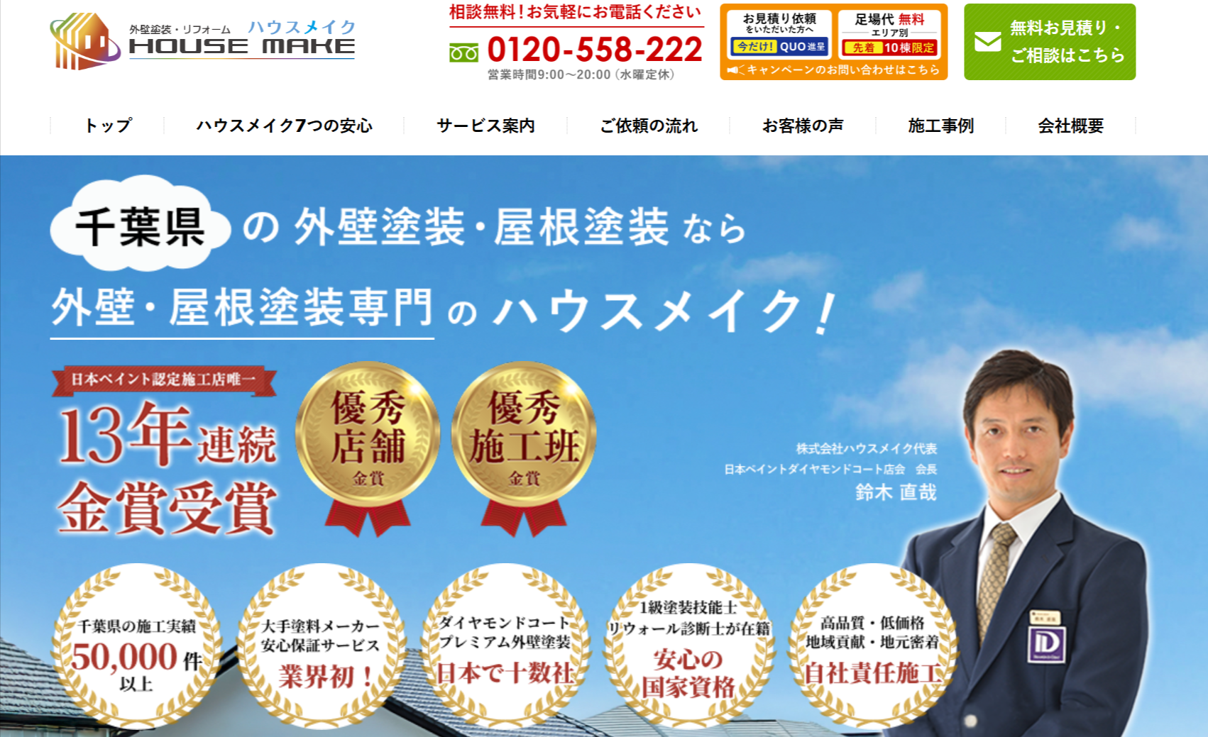 千葉県で外壁塗装・外壁リフォームをお考えなら、日本ペイントより優秀店舗・優秀施工賞ダブル金賞を受賞した千葉県トップクラスの外壁塗装会社ハウスメイクにお任せください。腕の立つベテラン職人が丹念に仕事をします。