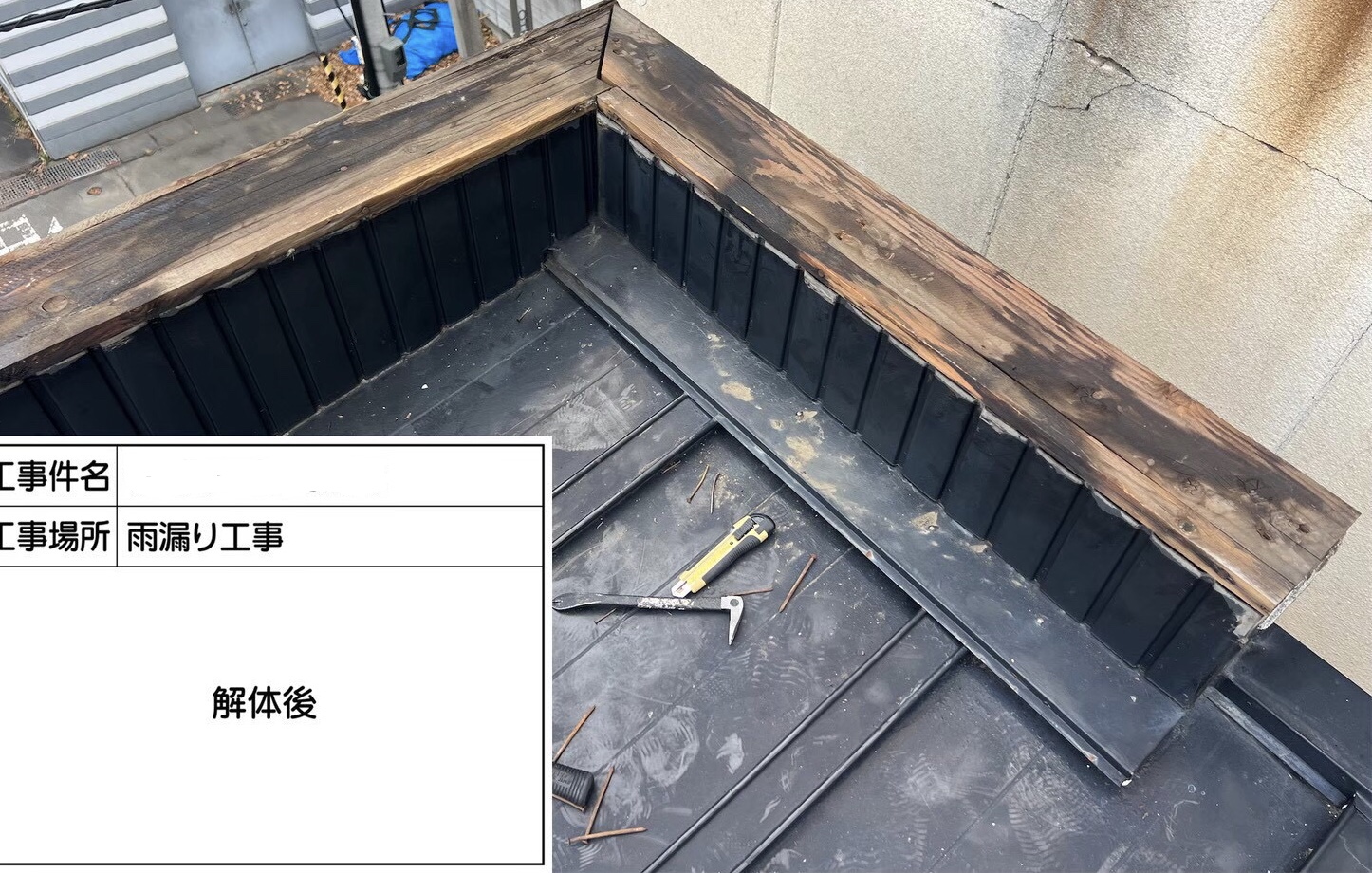 雨漏りが発生していた箇所の下地を解体し、劣化部分を新しい木下地へ交換しました。 その後、防水シートを施工し、雨水の侵入を防ぐ構造へと補修しています。