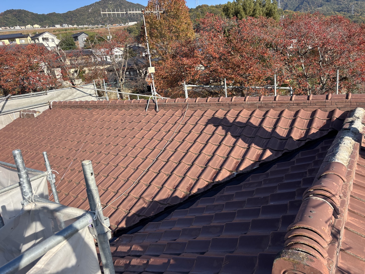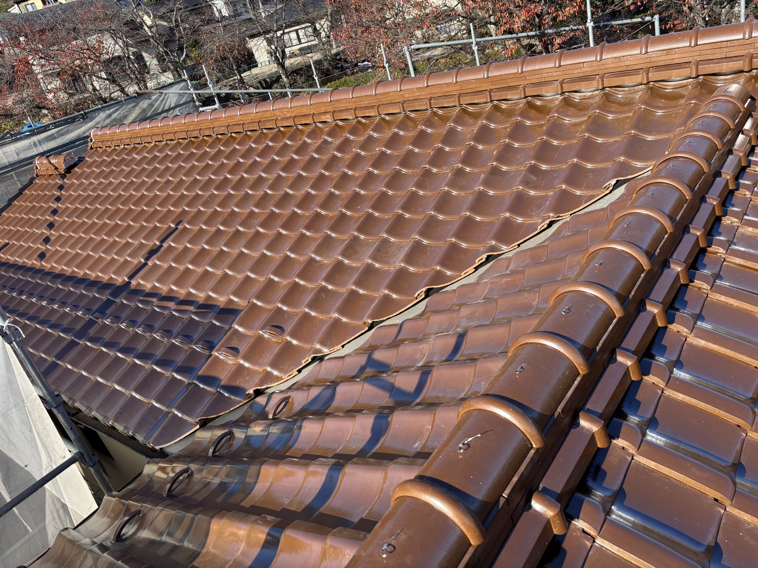 今回の工事では、漆喰が剥がれてきた棟部分の巻替え工事を行いました。 棟の漆喰が剥がれてしまう主な原因は、経年劣化だけでなく、棟瓦の積み方や施工方法にあるケースが多く見受けられます。そのため、漆喰だけを塗り直す補修工事を行っても、根本的な原因が解決されていなければ、いずれ再び剥がれや崩れが発生してしまいます。 今回の工事では、棟を一度解体し、現在のガイドライン工法に基づいて巻き替えを行いました。現行の工法では、漆喰や屋根土を使用せず、耐震性・耐久性にも優れた構造となるため、将来的な不安を大きく減らすことができます。 棟の補修工事は、金額の安さだけで判断するのではなく、原因を正しく見極め、適切な工法で施工できる業者に依頼することが重要です。棟の漆喰の剥がれやズレが気になる方は、早めの点検・ご相談をおすすめします。
