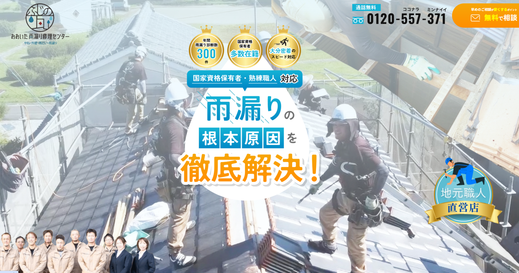 年間雨漏り診断数300件!大分県密着型のスピード対応は「おおいた雨漏り修理センター」!国家資格保有者多数在籍。熟練職人が対応で安心。どんな小さなお悩みでもお気軽にご相談を!