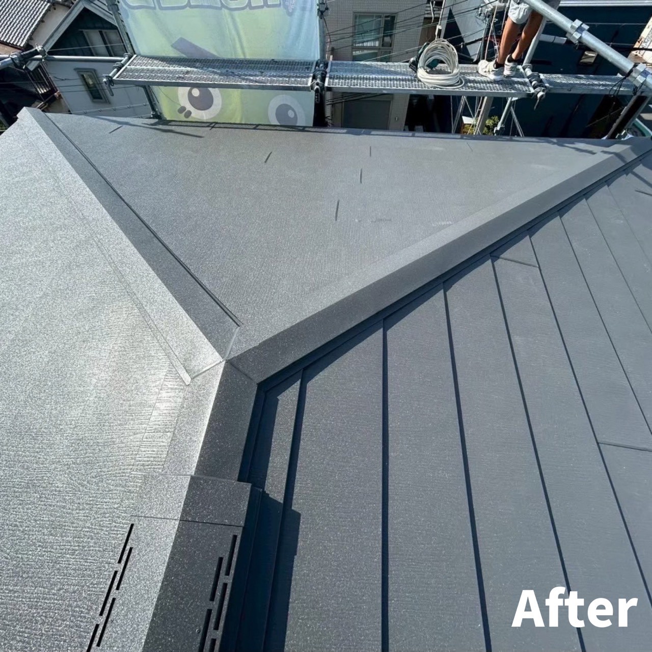 "3階の天井から雨漏りがあり、不安になって相談しました。 調査の結果、原因が屋上防水の劣化と分かり、丁寧に説明していただけたので安心してお願いできました。 工事では防水だけでなく、将来のことを考えて屋根の状態も確認してくださり、スレートの割れも見つけてもらいました。 屋根はガルテクトでカバー工法を提案していただき、耐久性や軽量性についても分かりやすく説明してもらえました。 工事後は雨漏りも止まり、見た目もきれいになってとても満足しています。 10年保証が付いているのも安心材料になりました。 最初から最後まで誠実に対応していただき、お願いして本当に良かったです。"