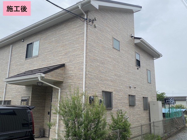 高圧洗浄後、下地調整を行い塗装前の状態を整えました。 ひび割れや細かな劣化部分は補修を行い、下地の強度を高めています。 下塗り・中塗り・上塗りの3工程で丁寧に仕上げています。 塗膜に十分な厚みを持たせることで、防水性と耐久性を向上させました。