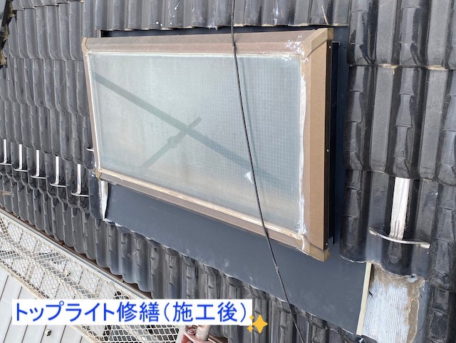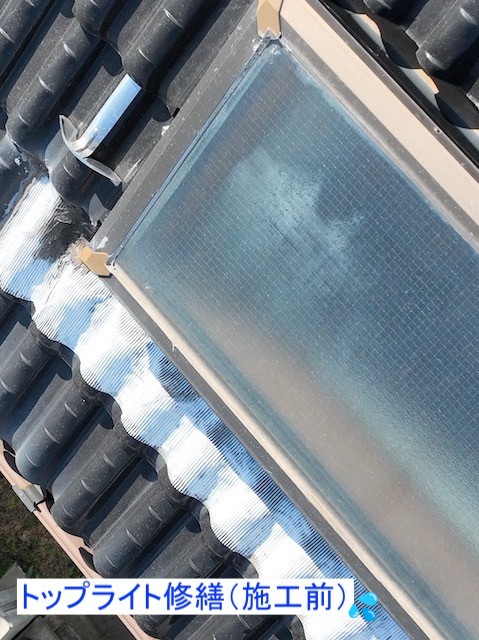 上尾市で、トップライトの雨漏り修繕を行った様子をご紹介します。お客様は、トップライトからの雨漏りにお困りでした。無料調査にて、過去の誤ったコーキング修繕が原因と確認したため、周囲の屋根瓦を一度撤去して水切り板金を取り付けました。