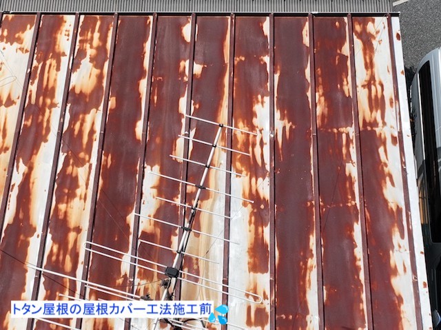上尾市でサビ付いたトタン屋根の屋根カバー工法を実施!あわせて部分屋根塗装や雨樋交換・軒天修繕を行い屋根を一新しました