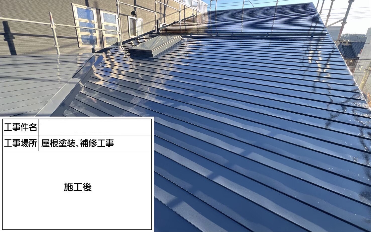経年劣化した金属屋根の下地調整を行い、耐久性の高い塗料で3工程塗装しました。 サビや旧塗膜を丁寧に処理し、塗料の密着性を高めています。 中塗り・上塗りで十分な膜厚を確保し、防水性と耐候性を向上させました。 仕上げには耐久性に優れた塗料を使用し、長期間安心できる屋根に仕上げています。