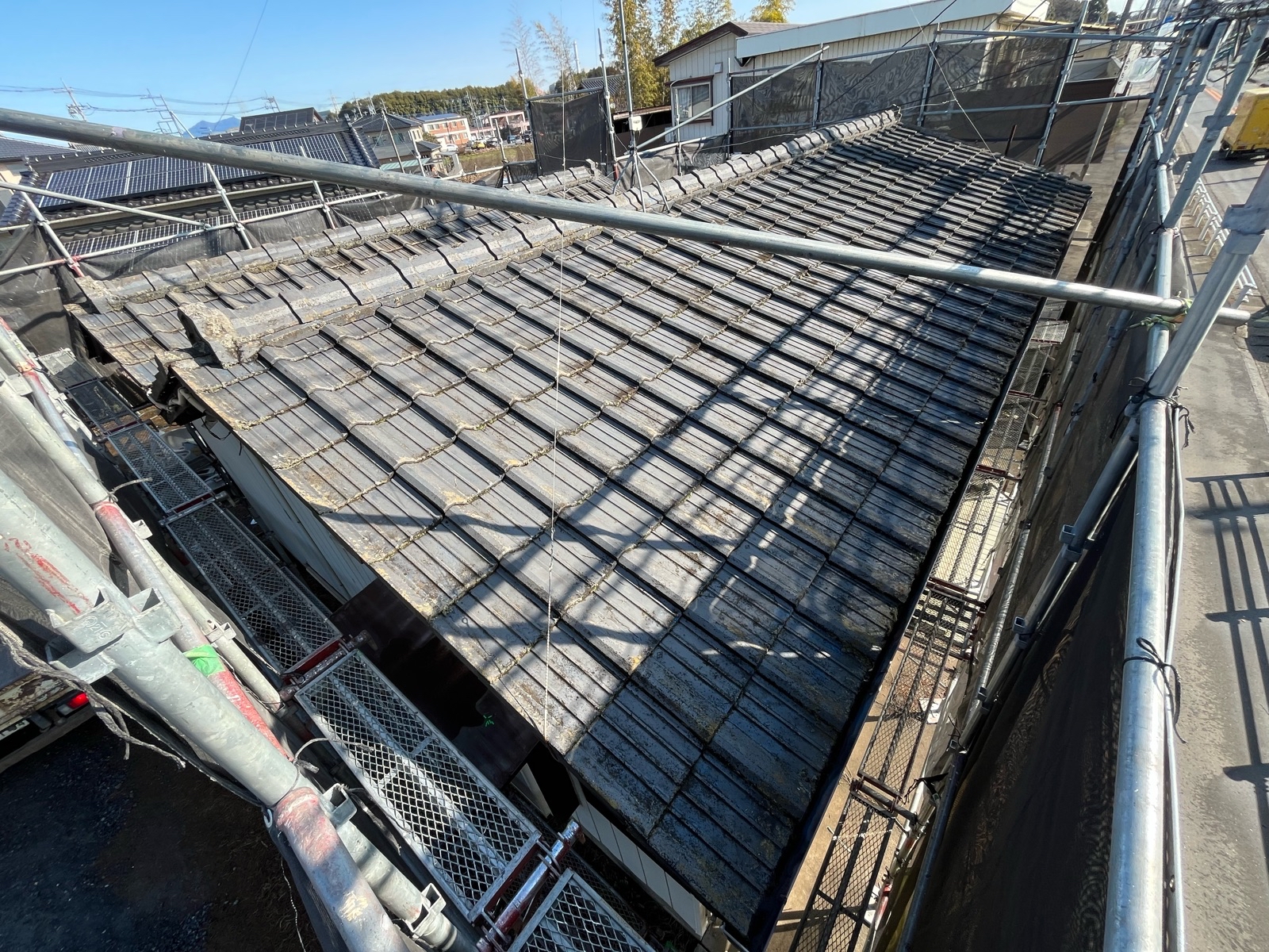 今回は屋根葺き替え工事の施工事例を紹介します。 こちらのお宅は、既存の瓦屋根のコーキングがびっしりに施工されていて、水が浸入しても逃げ道がない状態でした。 経年劣化も見られたため、既存の屋根を撤去し、新しく屋根を葺き替えました。 工事の流れとしては 既存の瓦屋根を撤去した後、 ・野地板施工 ・ルーフィング施工(防水シート) ・横暖ルーフαS の順番で丁寧に施工しています。 また、施工中は天候の変化にも注意を払い、 ブルーシートでしっかり養生を行いながら工事を進めました。 【横暖ルーフαSとは】 高耐久の金属屋根材で、軽量かつ耐久性にも優れている屋根材です。 瓦屋根と比べて建物への負担を軽減できるため、安心して長くお住まいいただけます。 更に、防水性や断熱性にも優れており、快適な暮らしをサポートしてくれます。