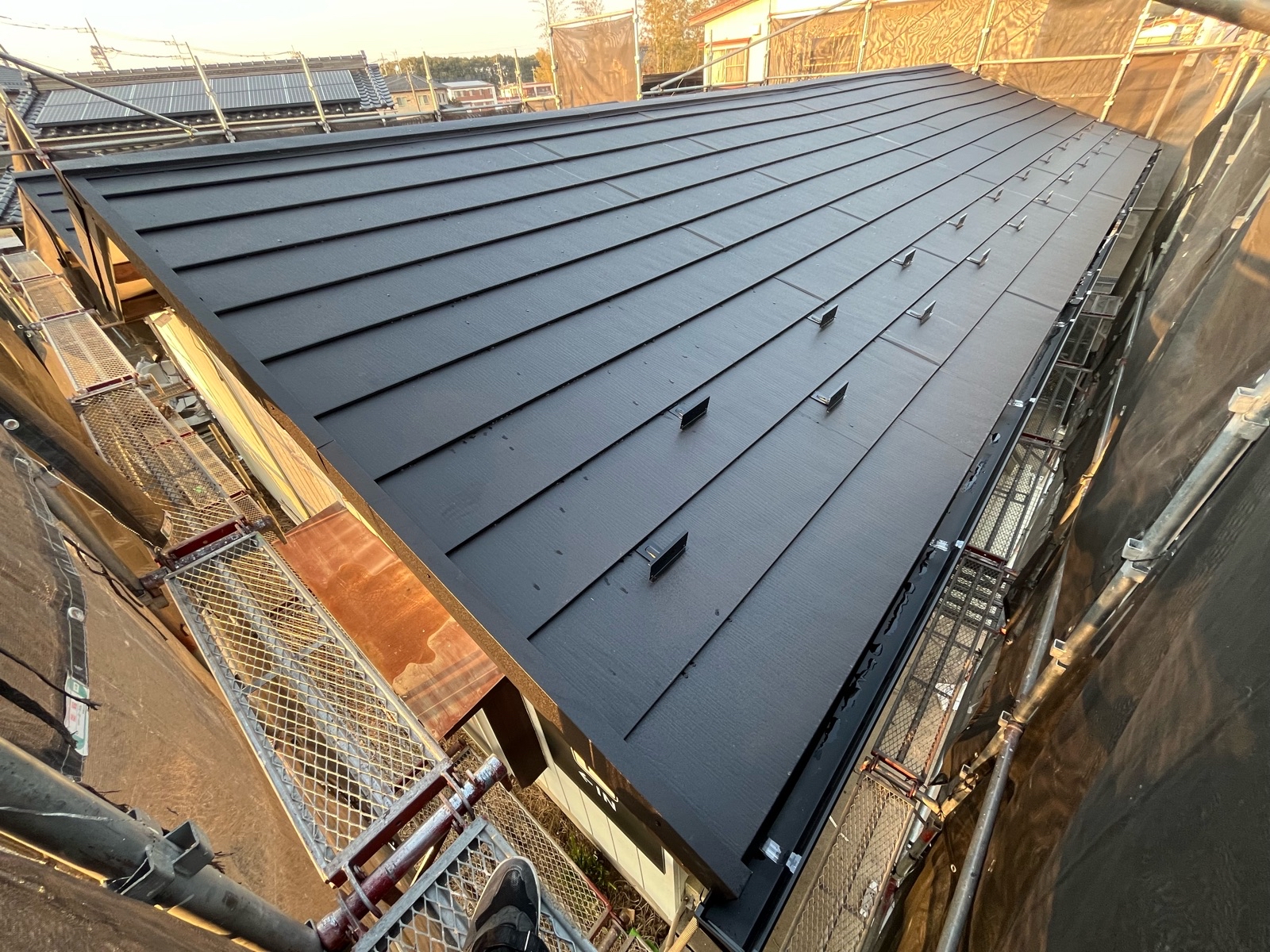 既存屋根材を一部撤去し、劣化したルーフィングを新しい防水シートへ張り替えました。 下地状態を確認しながら、雨漏りリスクの高い箇所を重点的に補修しています。