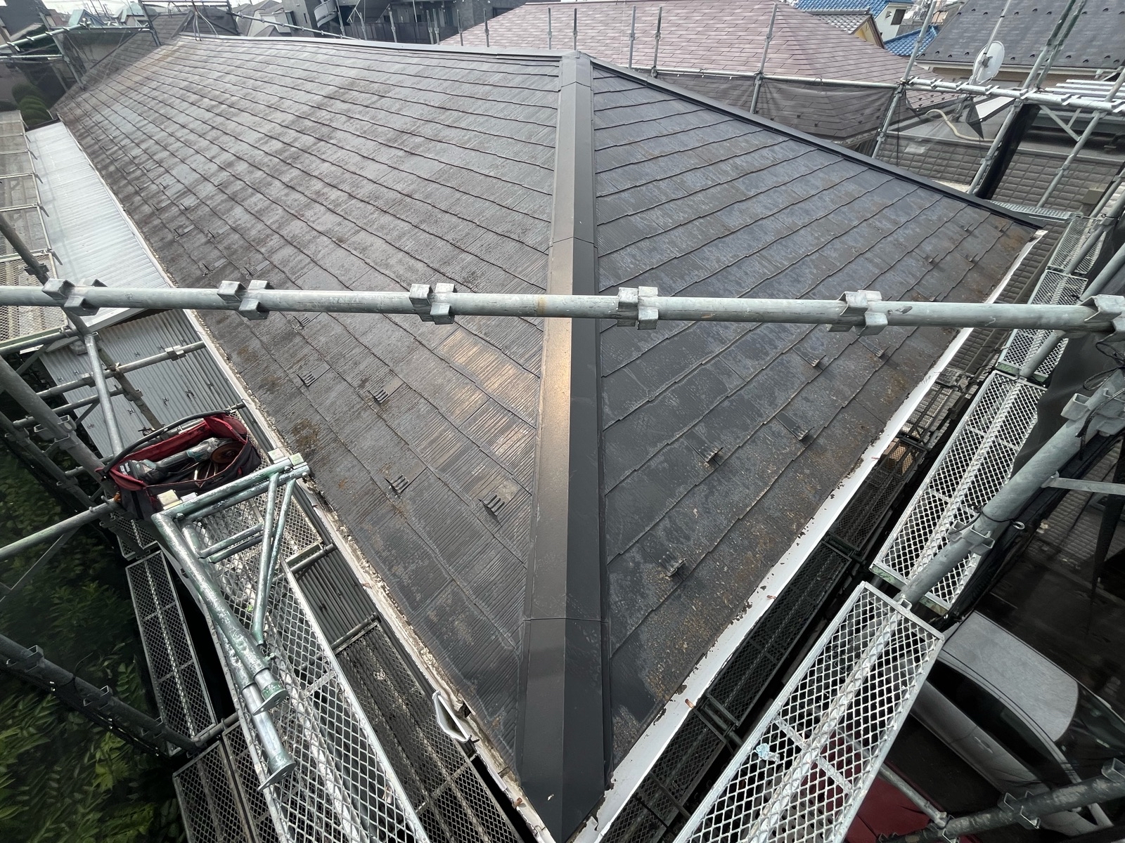 今回のご相談は、3階建て住宅の3階部分で雨漏りが発生しているというものでした。 雨漏りが確認された位置の直上には屋上しかない構造であったため、屋上を重点的に調査しました。 現地確認の結果、屋上防水層が経年劣化により機能低下している状態が判明しました。 防水層の傷みが進行し、雨水が内部へ浸入しやすくなっていたことから、今回の雨漏りは屋上防水の劣化が原因と判断しています。 あわせて屋根全体の点検も行ったところ、スレート屋根に色あせや防水性の低下が見られ、一部には割れも確認されました。 雨漏りとの直接的な因果関係はありませんでしたが、割れを放置すると今後の雨水浸入や劣化の進行につながる恐れがあるため、屋根についても対策を行うこととしました。 工事は、雨漏りの原因である屋上防水の改修と併せて、スレート屋根のカバー工法を同時に実施しています。 屋上防水では、不良箇所の撤去と下地調整を行い、改修ドレンを設置したうえで、ウレタン防水を2回塗りし、トップコートまで施工しました。 屋根工事は、既存のスレート屋根を撤去せず、その上から新しい屋根材を施工するカバー工法を採用し、防水性と耐久性の向上を図っています。 今回の工事により、雨漏りを解消するとともに、建物全体を安心してお使いいただける状態に仕上がりました。