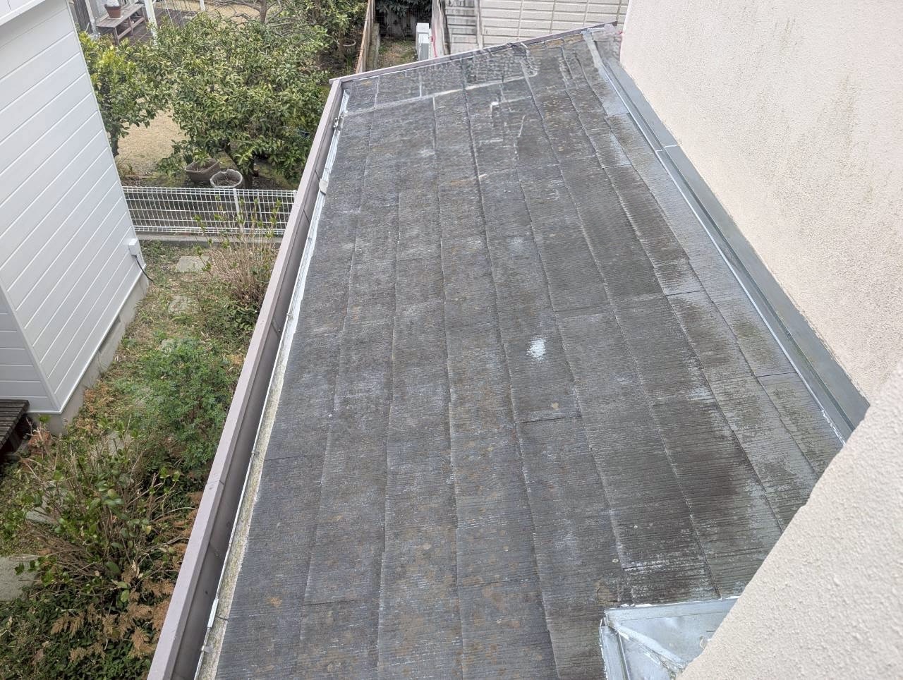 築20年を迎えたタイミングで、屋上を中心とした外装の点検をご希望いただきました。これまで大規模な改修は行っておらず、今回が初めての総合的なメンテナンスとなります。 現地調査では、屋上およびバルコニーのシート防水に小さな破れや端部の浮きが確認されました。シート防水は接合部や立ち上がり箇所から劣化が進みやすく、放置すると雨水の侵入経路となる可能性があります。下地の状態も踏まえ、補修ではなく改修を前提とした施工内容をご提案しました。 外壁についても、塗膜の退色やシーリング材の硬化・亀裂が見受けられました。目地部分は建物の動きに追従する重要な部位であるため、既存シーリングを撤去し、新たに打ち替えを実施。その後、下塗りを行ったうえで仕上げ塗装を重ね、防水性と美観を回復させています。 また、足場設置の機会を活かし、スレート(カラーベスト)屋根の更新も同時に行いました。今後の維持管理を見据え、軽量金属屋根「ガルテクト」によるカバー工法を採用。既存屋根を撤去せずに重ね葺きすることで、廃材処分費を抑えながら断熱性・耐久性の向上を図っています。 屋上防水・外壁・屋根を一体的に整備したことで、建物全体の保護性能が向上しました。築20年前後は外装各部の劣化が顕在化しやすい時期です。足場を共有して工事をまとめることで、長期的な維持コストの最適化にもつながる内容となりました。