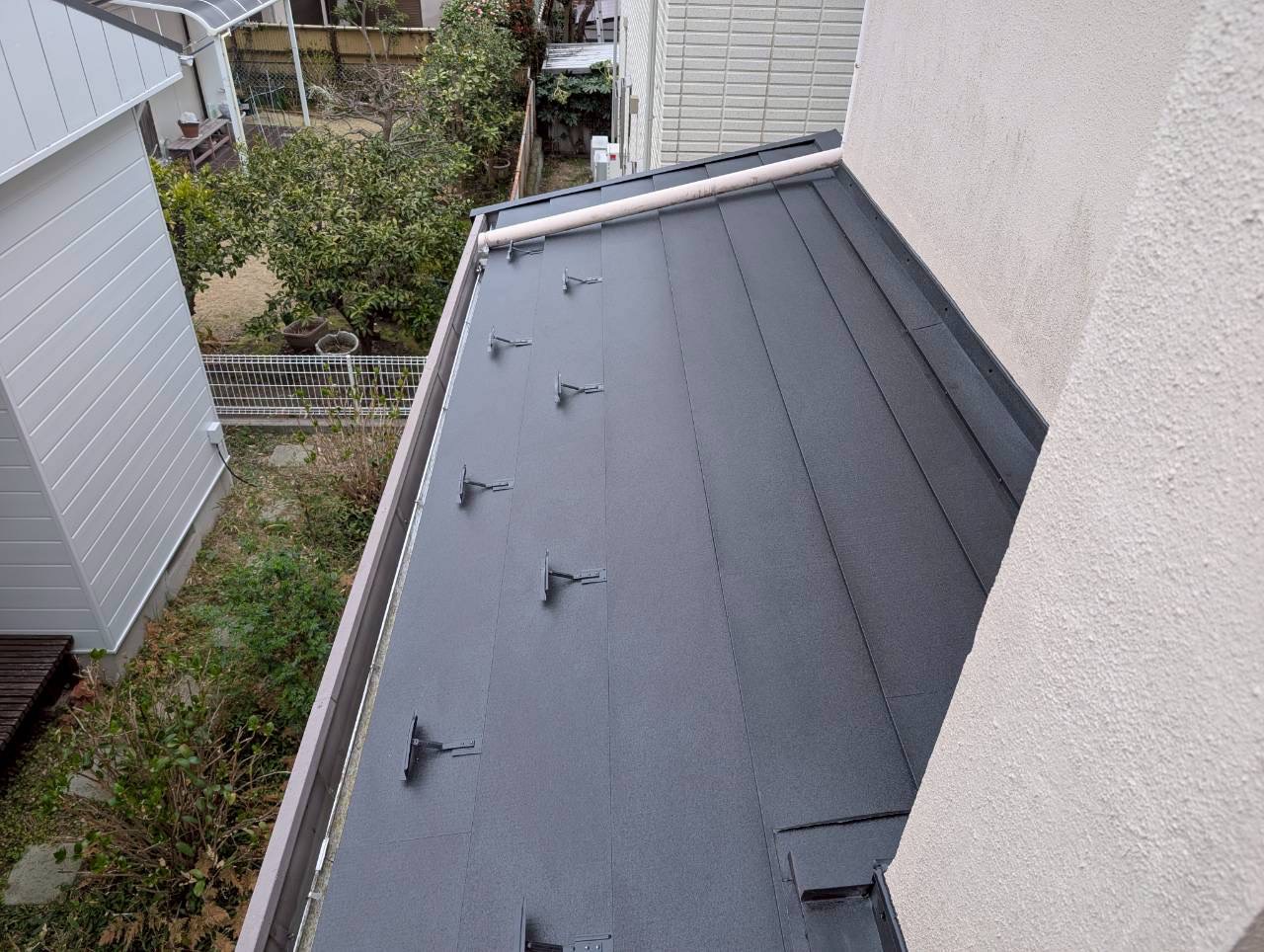 経年劣化した金属屋根の下地調整を行い、耐久性の高い塗料で3工程塗装しました。 サビや色あせを抑え、防水性と美観を回復する仕上げとしています。